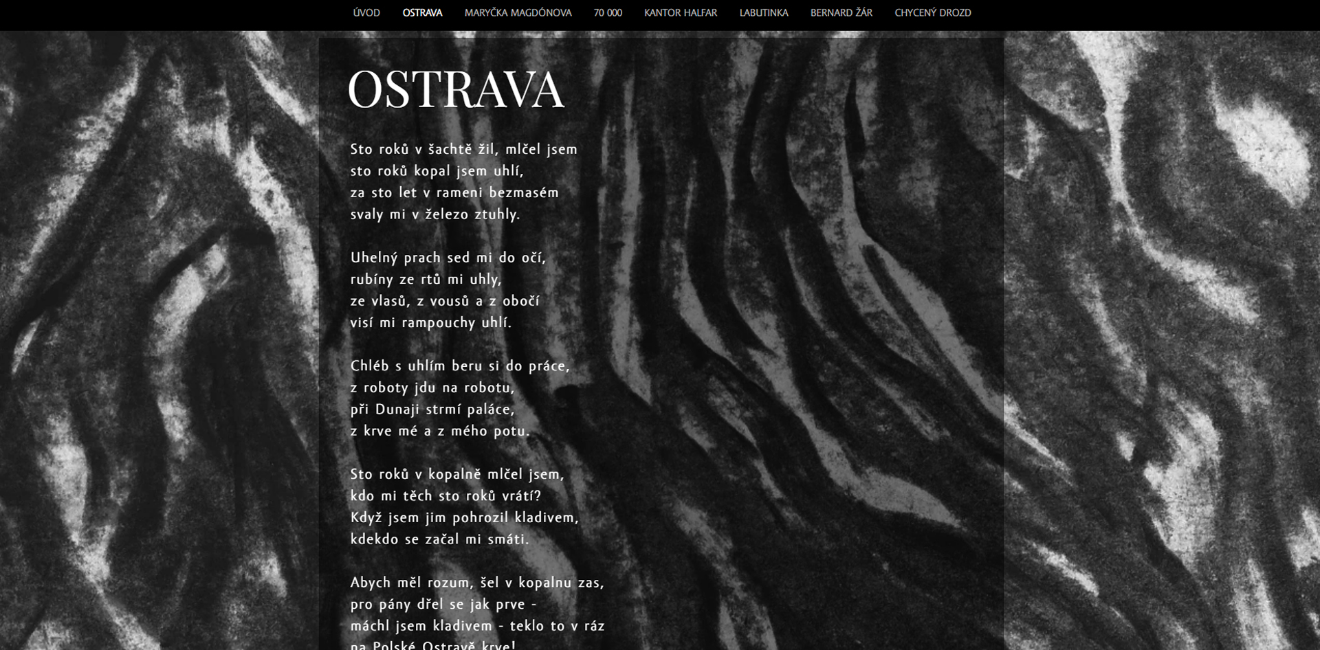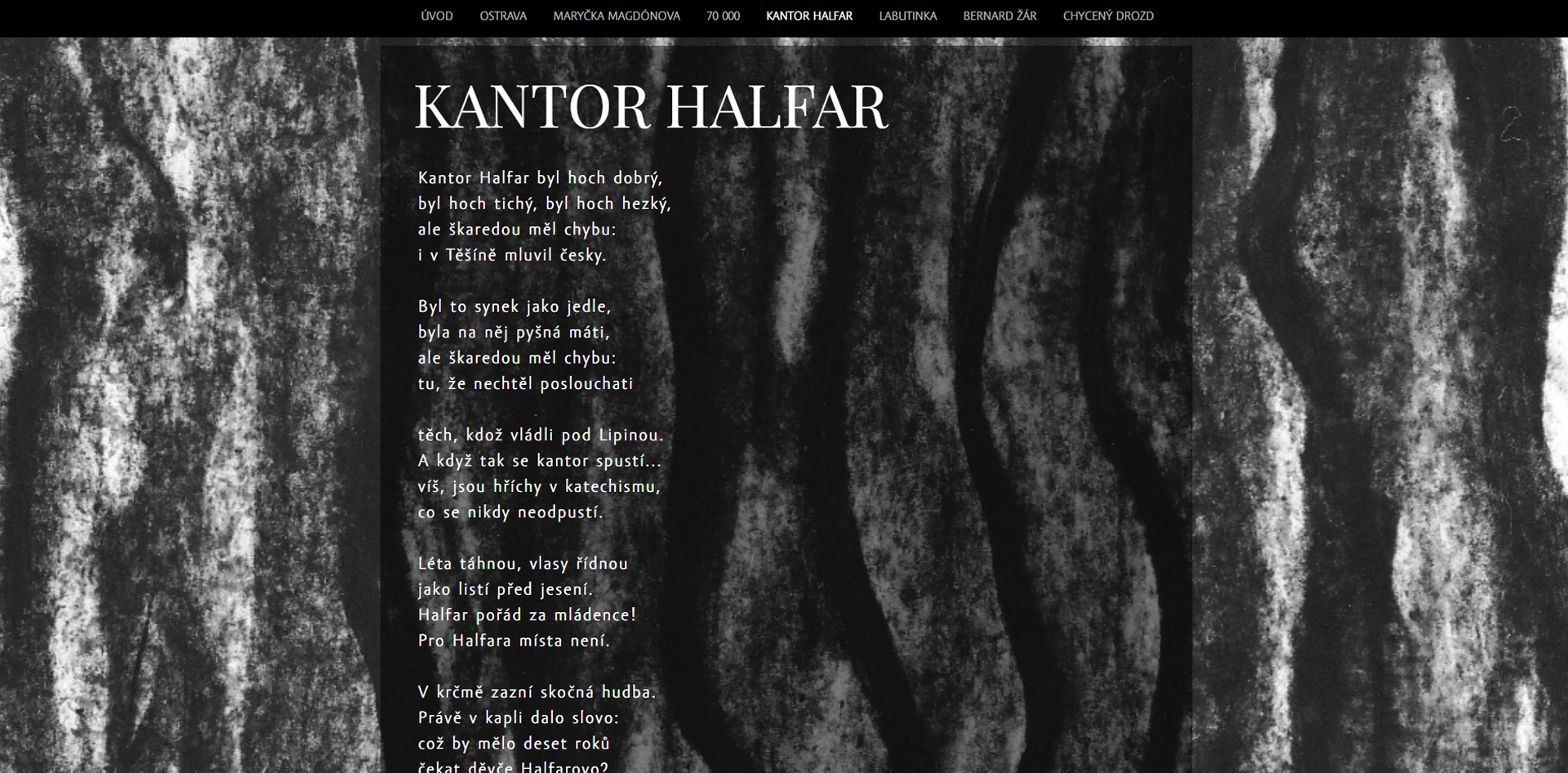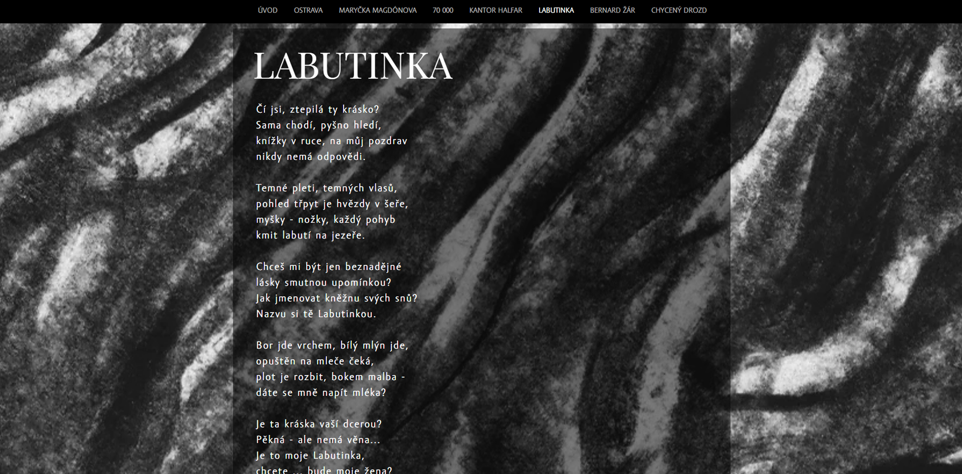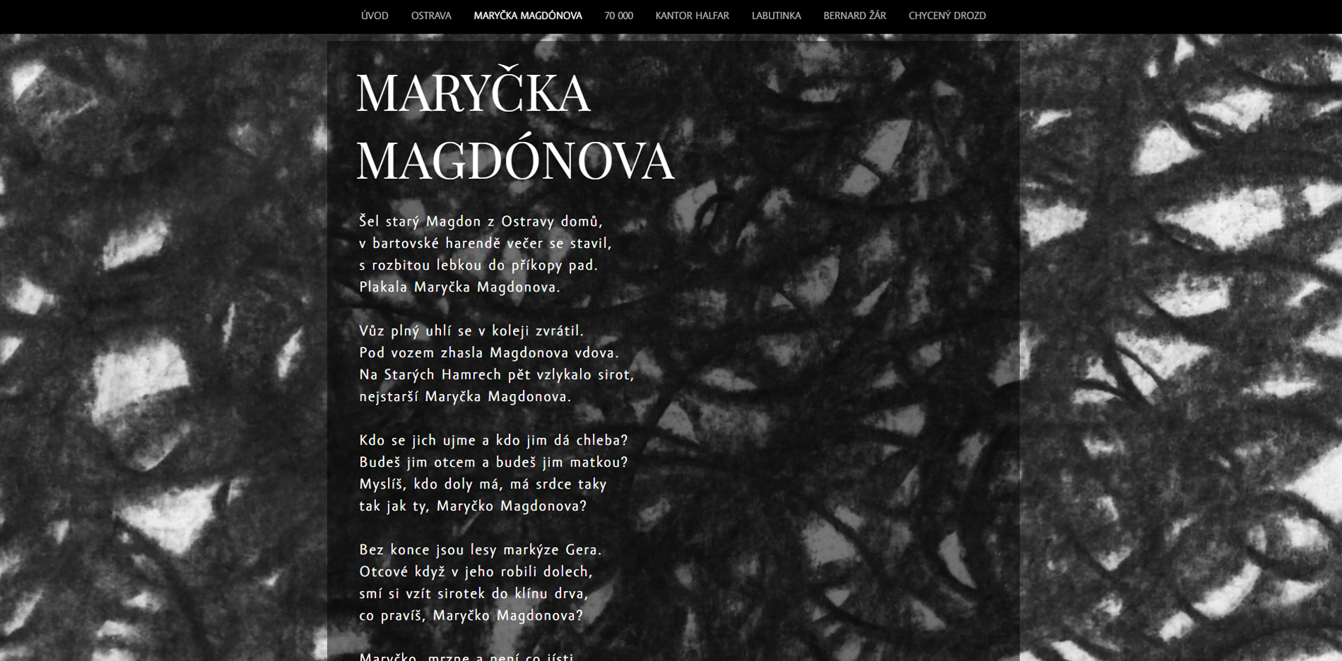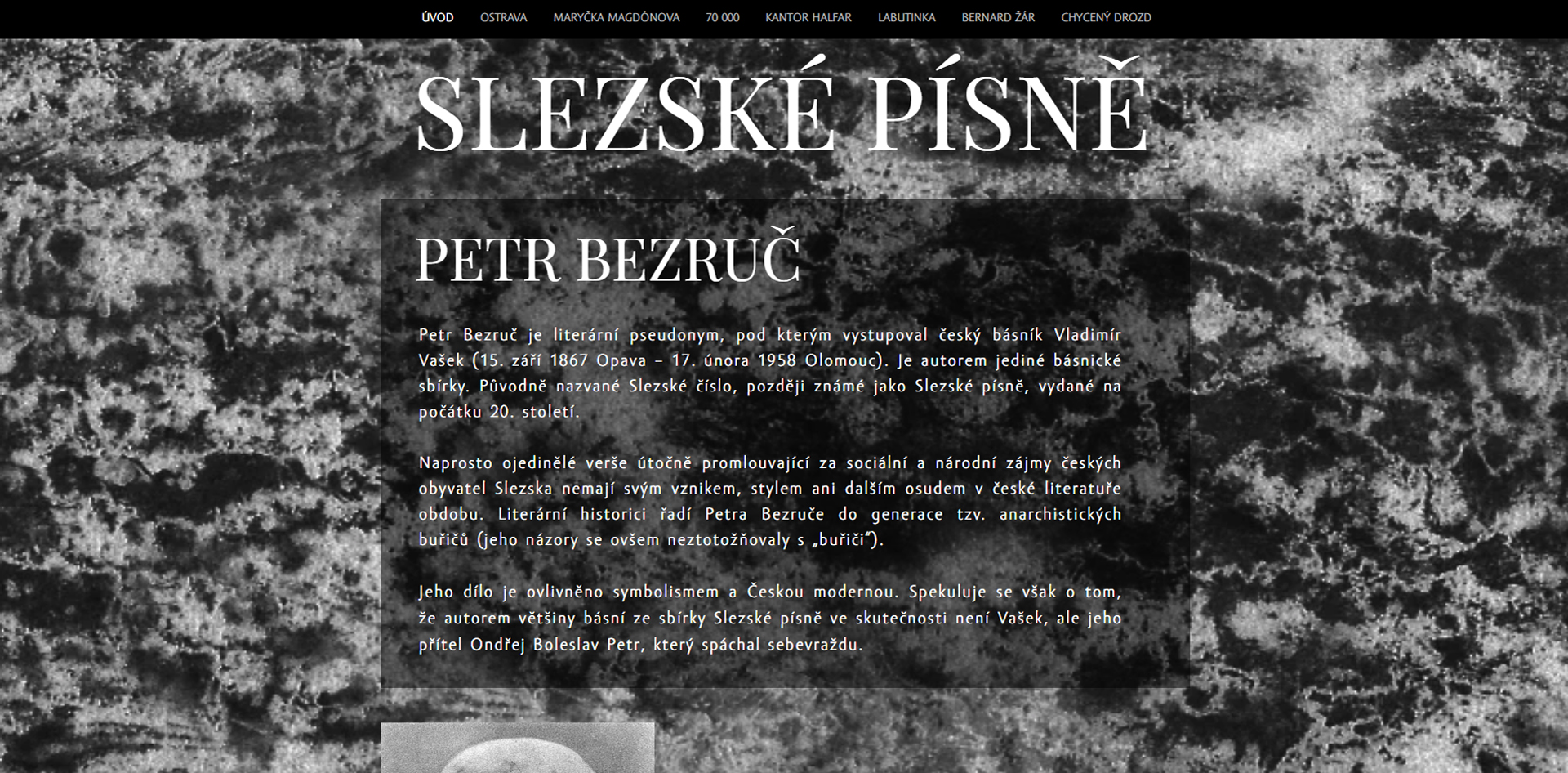 Jednoduchý web s básnickou sbírkou Petra Bezruče. Při vstupu se zobrazí úvodní stránka s informacemi o autorovi, k poezii se lze prokliknout přes ukotvenou horní lištu. Každá stránka obsahuje odlišné černobílé pozadí, které má za cíl vyvolat depresivní atmosféru typickou pro Petra Bezruče, pocity stísněnosti a zoufalství.