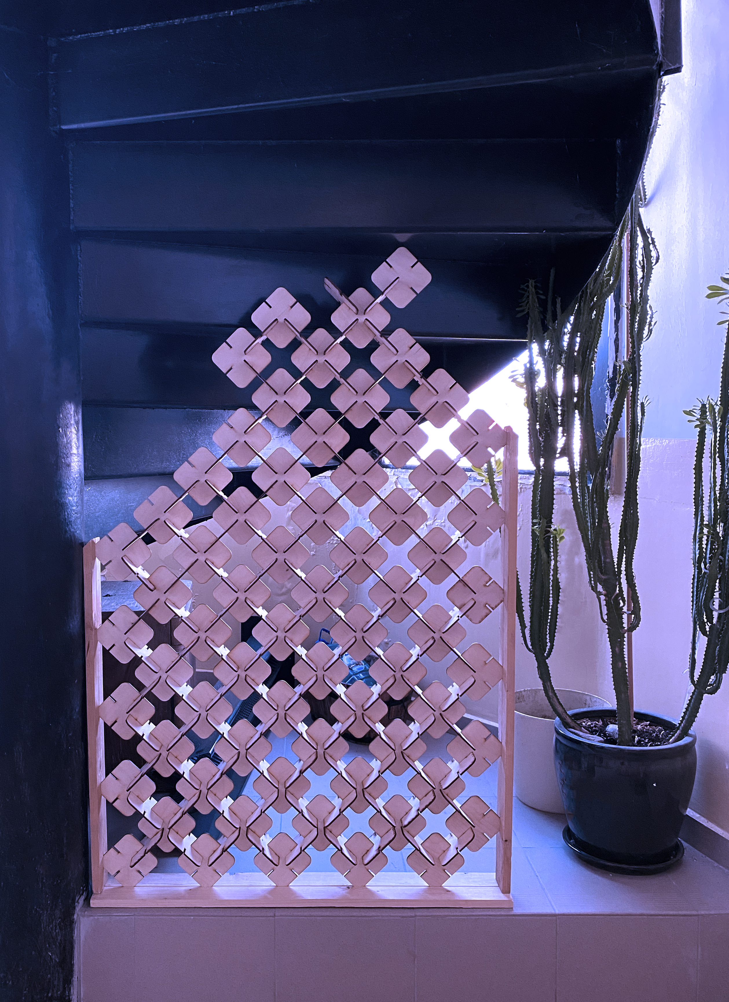Paraván sa skladá z jednotlivých častí štvorcového tvaru s rozmermi 10x10 cm. Na každom zo štvorcov sú po stranách vyrezané ryhy, pomocou ktorých do seba jednotlivé časti zapadajú a vytvárajú zaujímavú štruktúru. Realizovaný model je vsadený do konštrukcie pre pevnejšie státie a ľahšiu manipuláciu s objektom. Napojením, respektíve odpojením ďalších častí, je možné paraván zväčšovať alebo zmenšovať. Objekt je určený na rozdelenie akéhokoľvek priestoru na pracovisku, v domácnosti alebo vytvorenie intímnejšieho prostredia v kaviarni alebo reštaurácii.