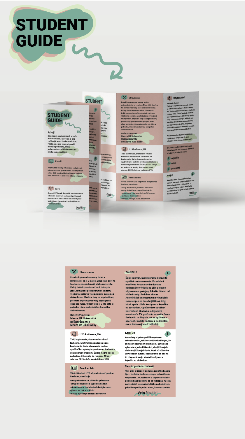 Pri brožúrke som zvolila netradiční design, ktorý priláka začínajúceho študenta a zároveň mu pomôže sa lepšie zorientovať. Obsah je sformulovaný do viacero tém ako je ubytovanie, strava, email, isic a taktiež informácie o tam kam si dať vytlačiť dokumenty. Farby som zvolila hravé a zároveň nie moc krikľavé. Názov vypovedá obsah "student guide ".