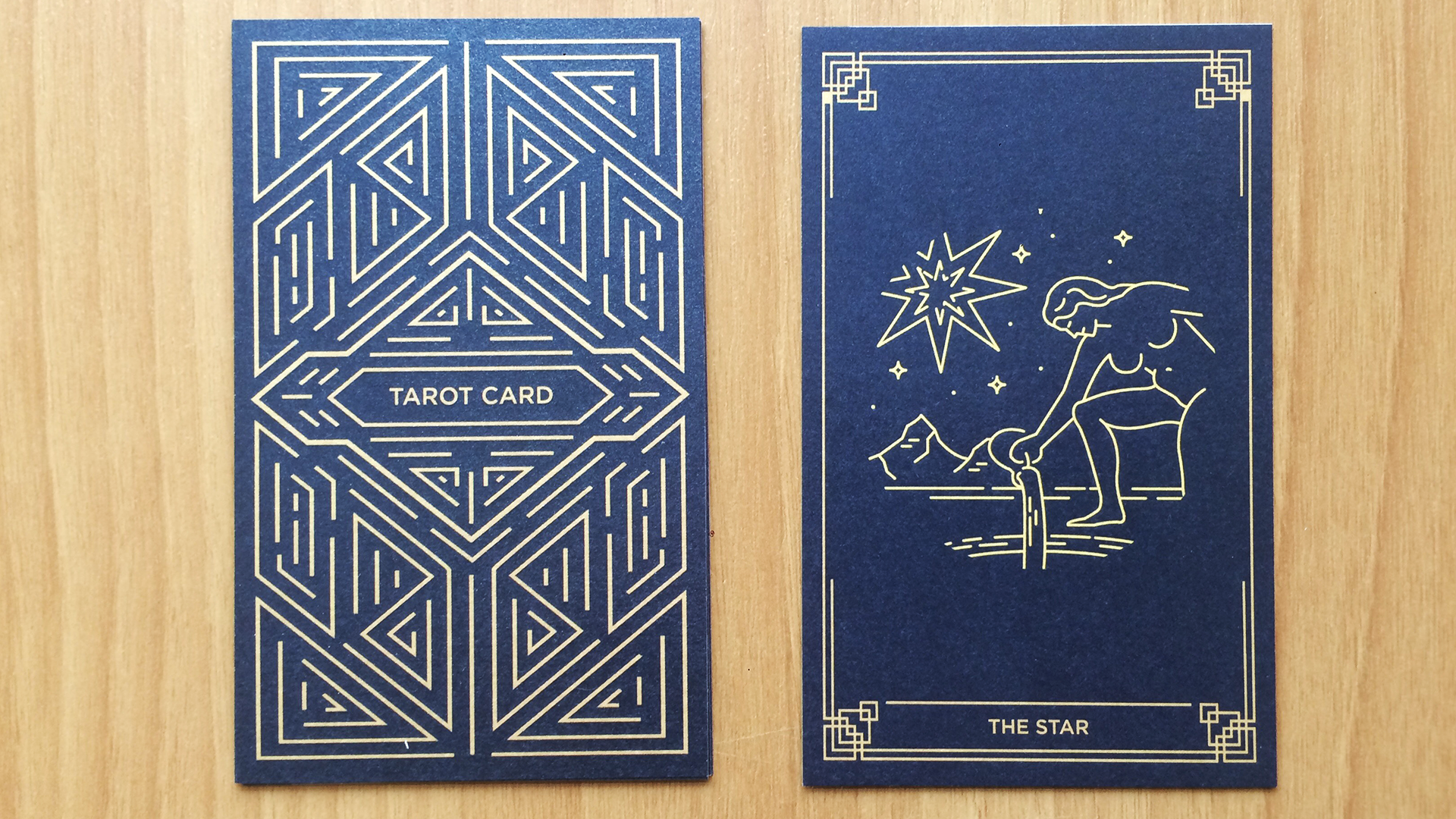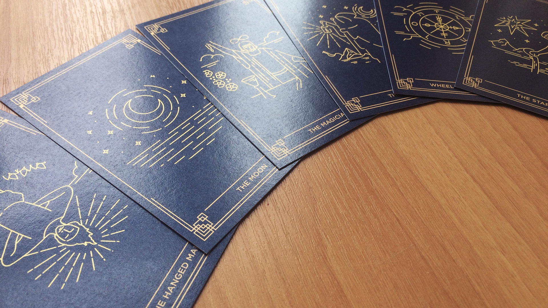 Návrh tarotových kariet v podaní minimalistických ilustrácií a jednoduchého, čistého dizajnu. Spojenie modrej a zlatej farby zvyšuje eleganciu kariet, ktoré sú potlačené na špeciálnom perleťovom papieri.