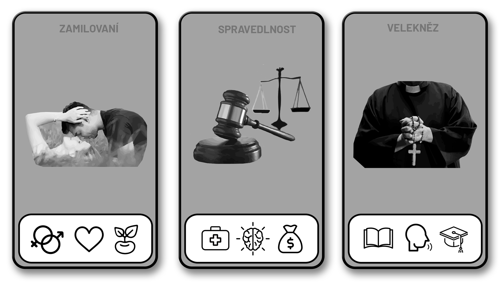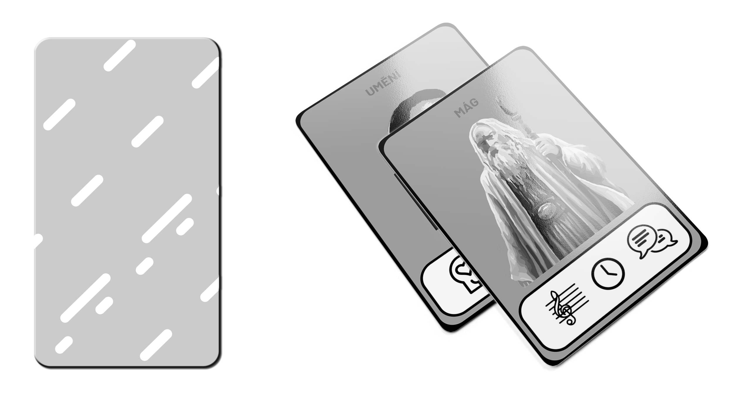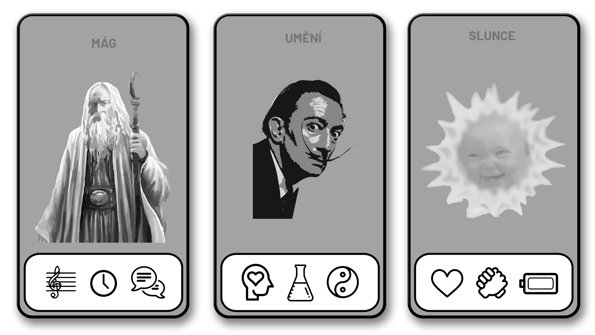 Návrh šesti tarotových karet. Ikony značí vlastnosti dané karty.