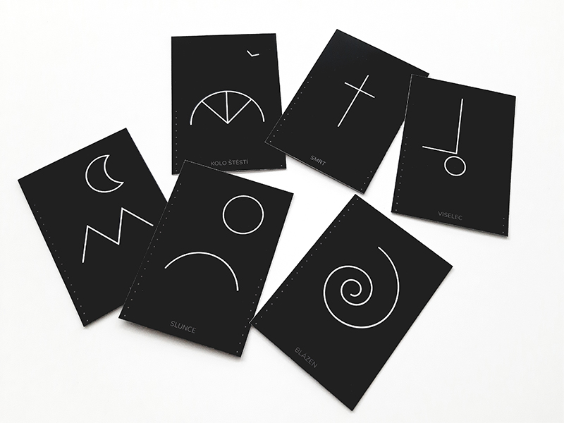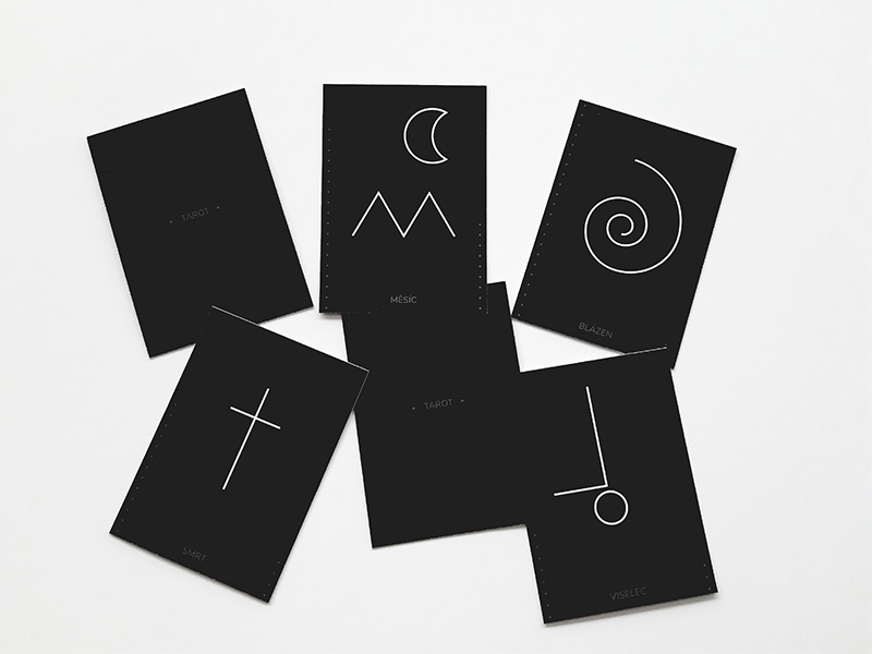 Návrh Tarotových karet. Minimalistické zpracování, kdy ve středu karty je hlavní motiv, zobrazující význam karty a po bocích jsou tečky které znázorňují číselné hodnoty, které se ke kartám váží. Ve spodní části je název karty. Zadní strana karty obsahuje pouze slovo TAROT.