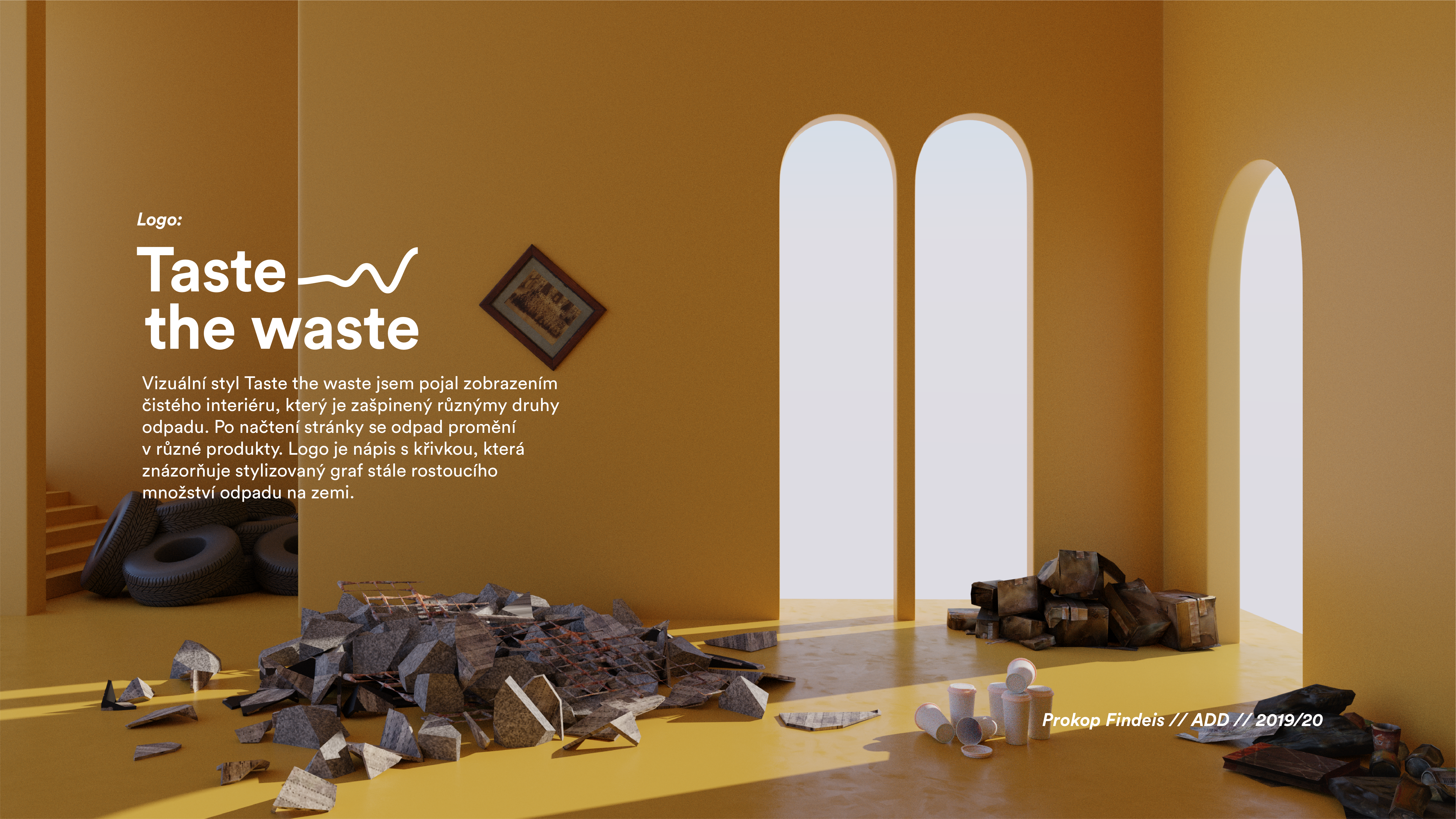 Vizuální styl Taste the waste jsem pojal zobrazením čistého interiéru, který je zašpiněný ruznýmy druhy odpadu. Po načtení stránky se odpad promění v různé produkty. Logo je nápis s křivkou, která znázorňuje stylizovaný graf stále rostoucího množství odpadu na zemi.