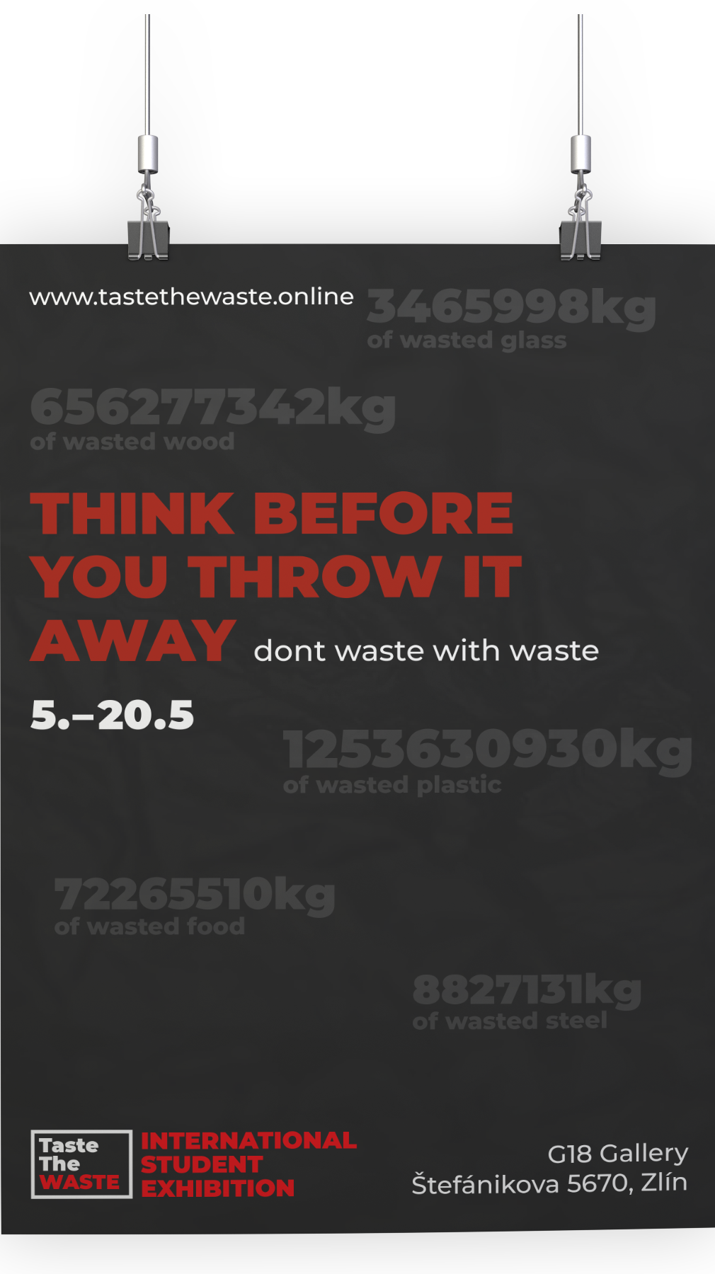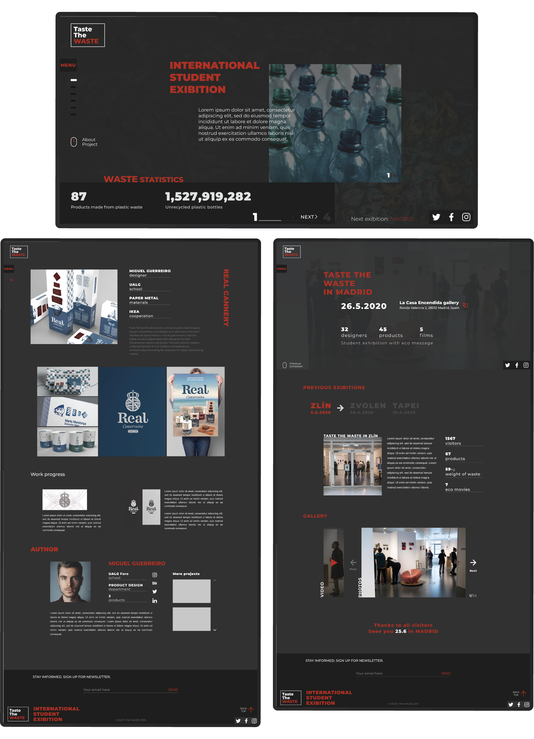 Vizuálny štýl, projektu taste the waste som sa snažil odlíšiť od ostatných projektov a kampaní zameraných na na ekológiu, alebo šetrenie odpadom. Zvolil som tmavú farebnosť, so sýto-červenými nadpismi a interakčnými prvkami. Samotný web neobsahuje iba produkty, ale aj informácie o materiáloch, či spolupracujúcej firme, ako aj informácie o autorovi. Aby mal projekt väčší dosah, vytvoril som subbrand Taste the waste Eco, ktorý by mohol ponúkať rôzne články o ekológii, alebo mapy najbližších obchodov bez plastov. V tlači a offline kampani sa využívajú čísla, zle využitého odpadu a vety motivujúce k znovu-využitiu odpadu.