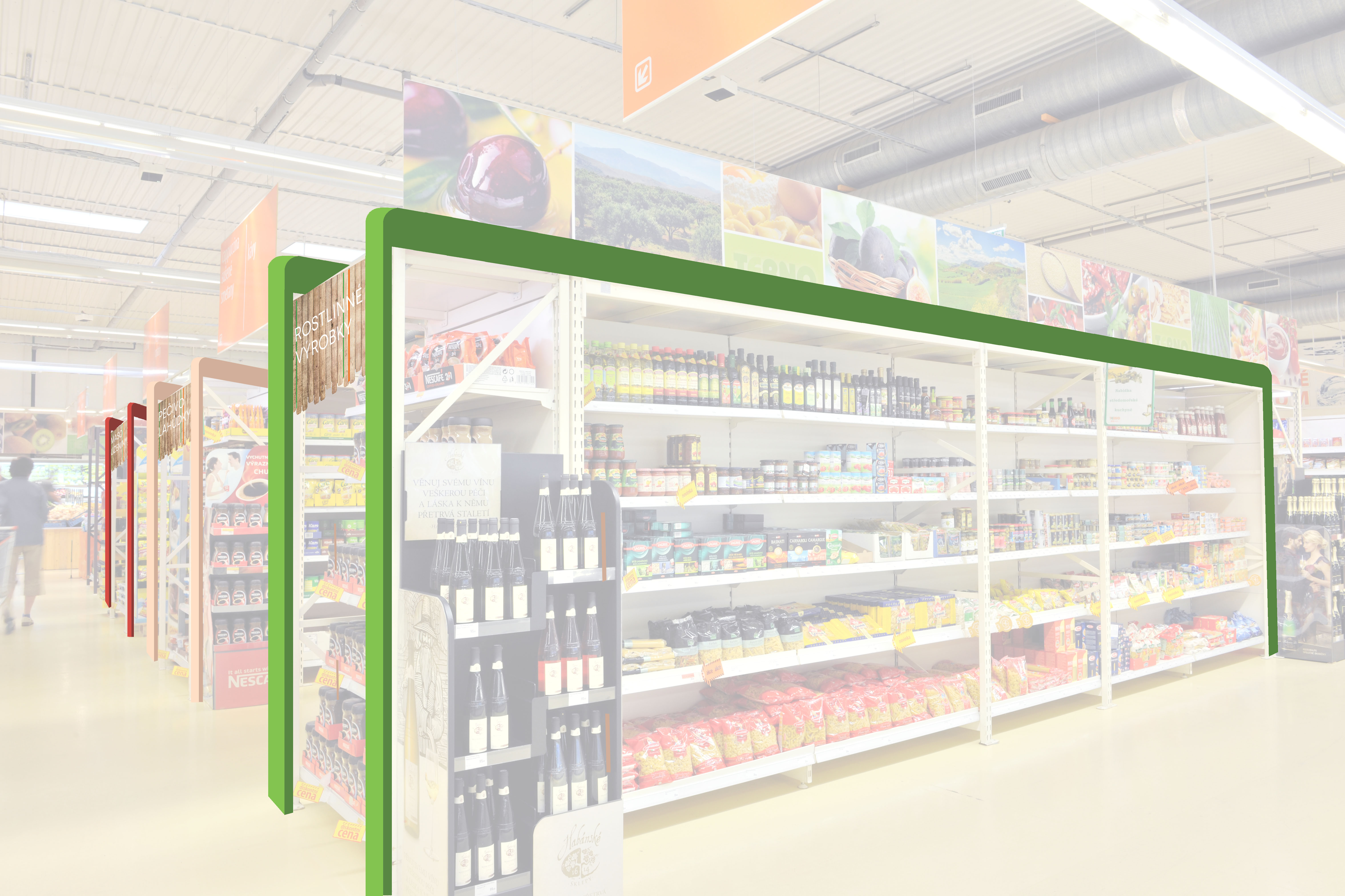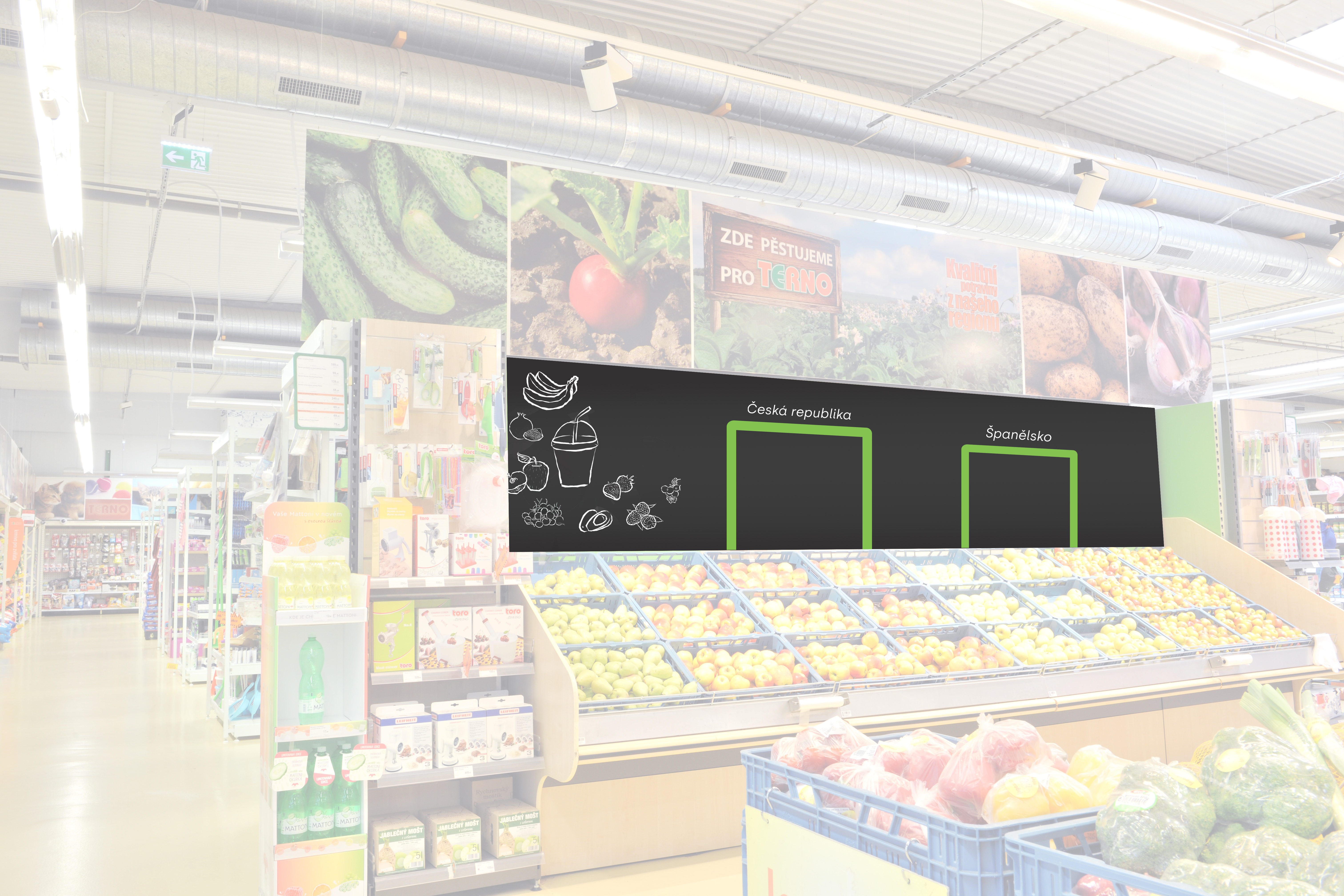 Jde tedy o zapojení dřeva jako symbolu farmářství a pro navození haptického pocitu. To je použito na blendy nad regály u zdí a doplněno o linie v korporátních barvách za účelem propojení brandu s vizuálním stylem.