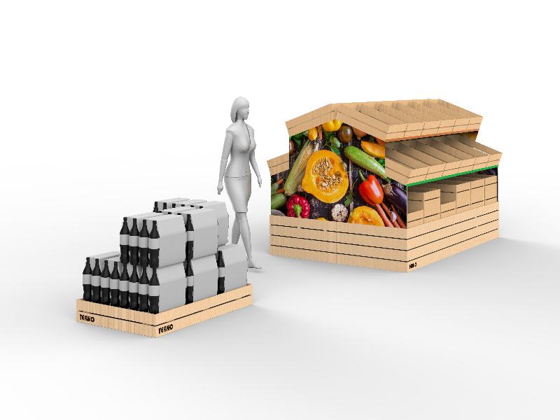 Regál do sekce zeleniny a paletová lišta je navrhnuta pro obchodní řetězec Terno. Hlavní myšlenkou návrhu je navázat na sortiment regionálních, místních a farmářských výrobků. Regál se skládá z kovové či dřevěné konstrukce, která nese dřevěné bedny se zeleninou a ovocem. Druh sortimentu v daném patře je oddělen barvou lišty (oranžová = ovoce, zelená = zelenina), která zároveň drží bedny nakloněné k zákazníkovi. Na obou stranách se nachází plocha, která se dá využít pro vyvěšení reklamy. Paletová lišta slouží pro skrytí často nevzhledných a opotřebovaných palet. Skládá se ze dvou částí ve tvaru písmene L, které se dají složit a nezabírají mnoho místa při skladování.