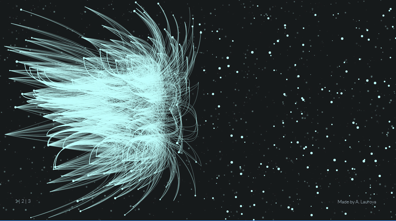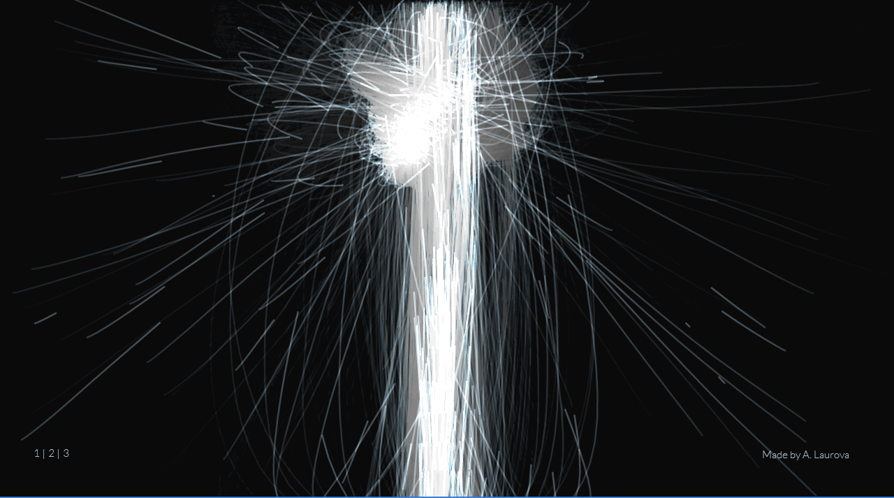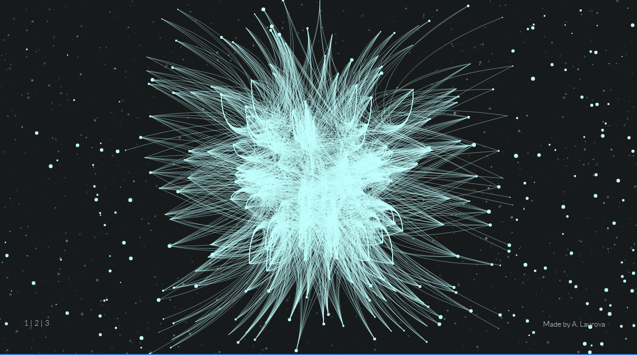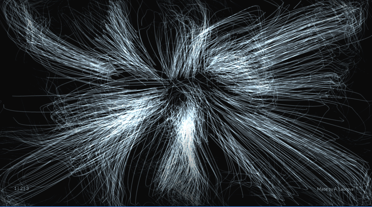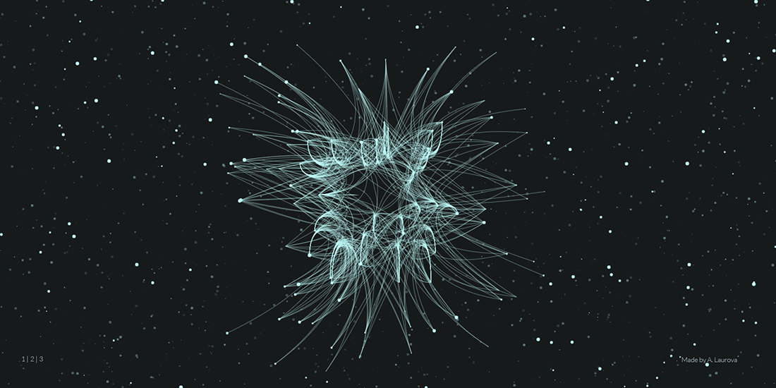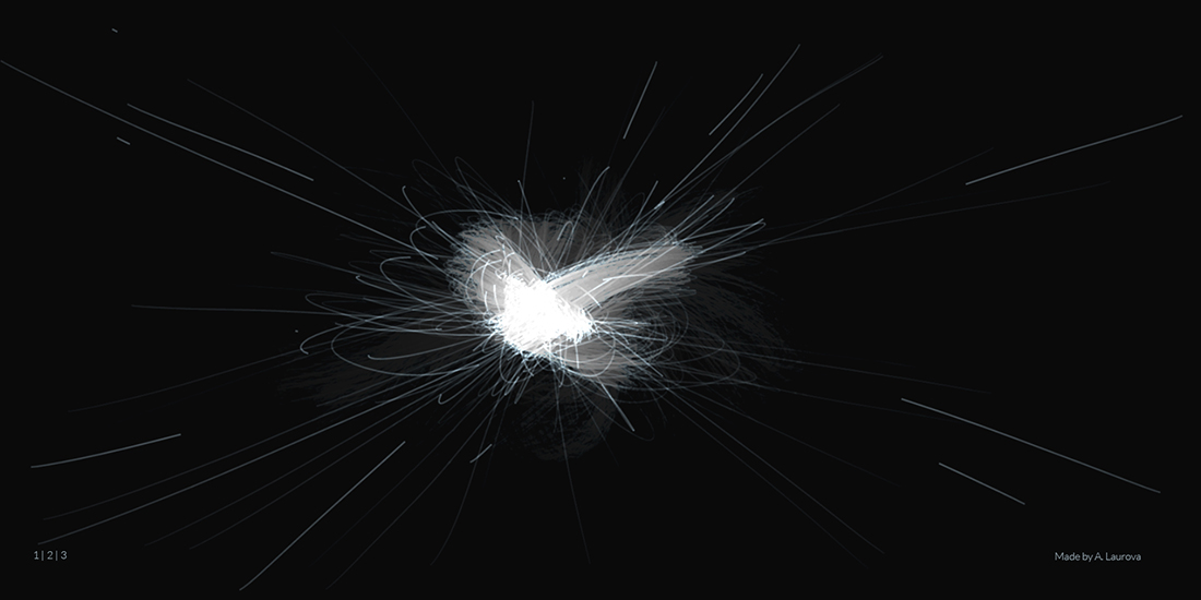Dynamic JavaScript web site is illustrating the particle chaos in a tiny fraction of a second after the Big Bang. The bright lines represent short-lived particles that are continually created and annihilated as they colide with each other.