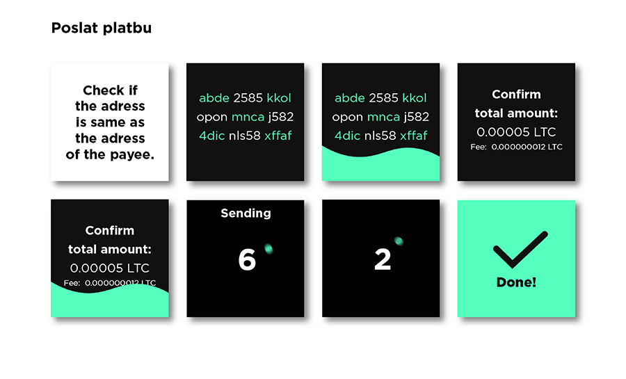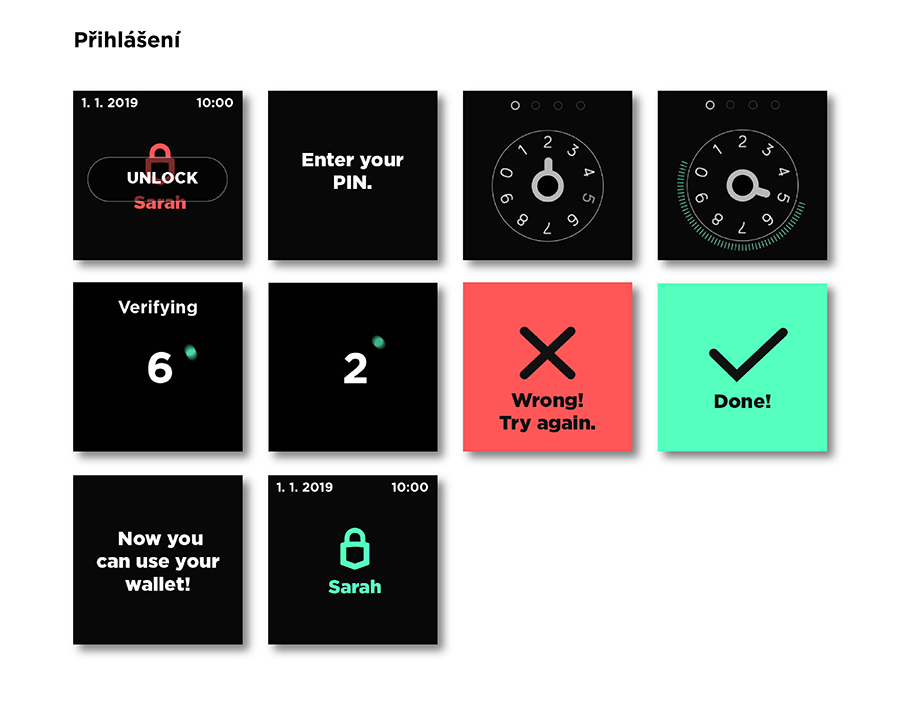 Návrh UI pro kryptoměnovou pěněženku Trezor. V původním UI byly nalezeny mezery především ve srozumitelnosti a satisfakci uživatele. Nový design je proto založen na potvrzování pomocí dlouhého stisknutí ,,long touch'' a na barvách, které symbolizují děje v aplikaci. Jednotlivé akce jsou podpořeny animací prvků, která dělá peněženku uživatelsky přívětivější.