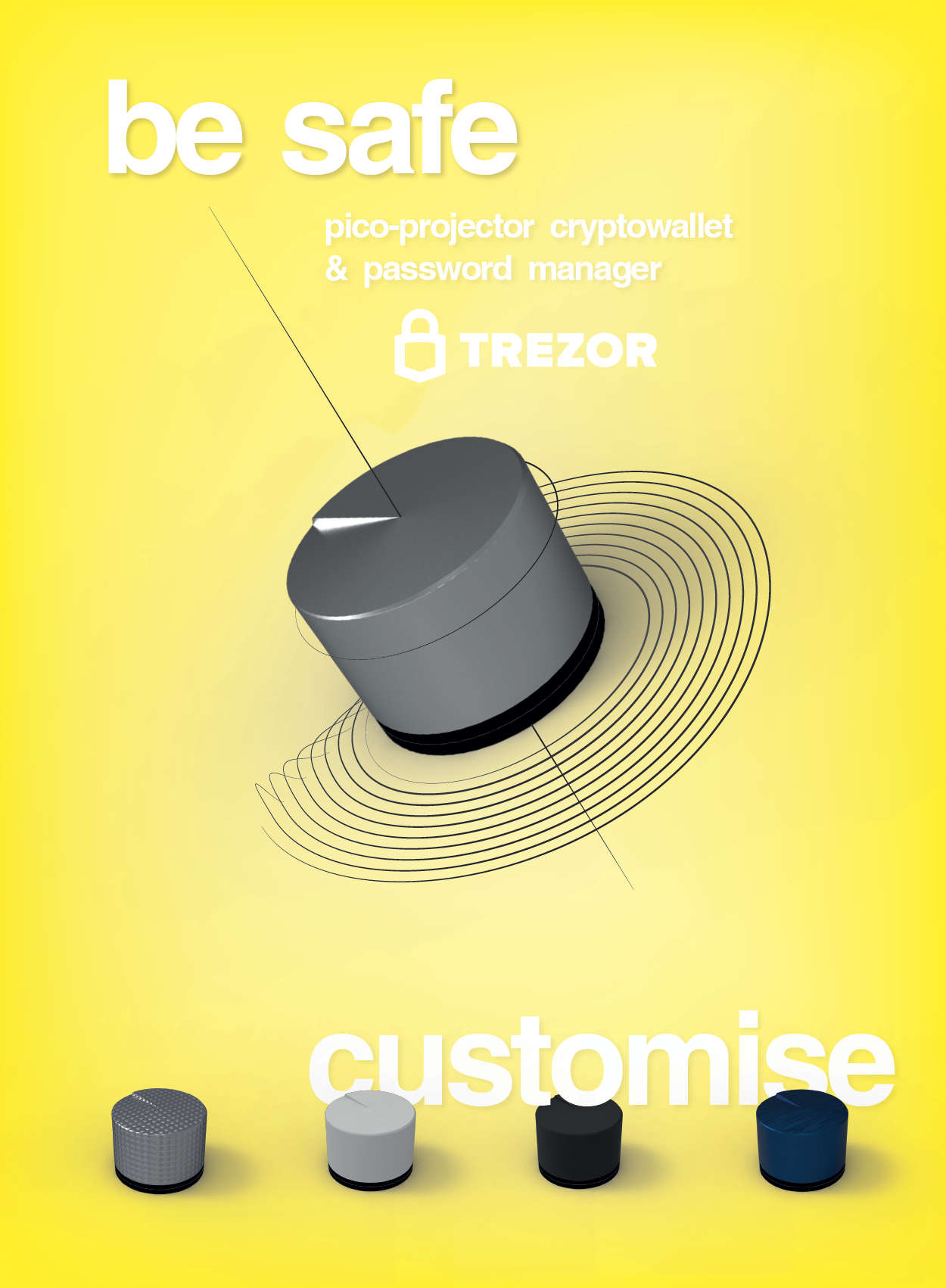 Bitcoinová peneženka a password manager. Vytvořeno jako future concept pro Satoshi Labs. Moje řešení využívá picoprojektor, zabudovaný v těle. Pomocí pohyblivého tlačítka uživatel zadává pin, keyphrase, případně potvrzuje kód transakce.