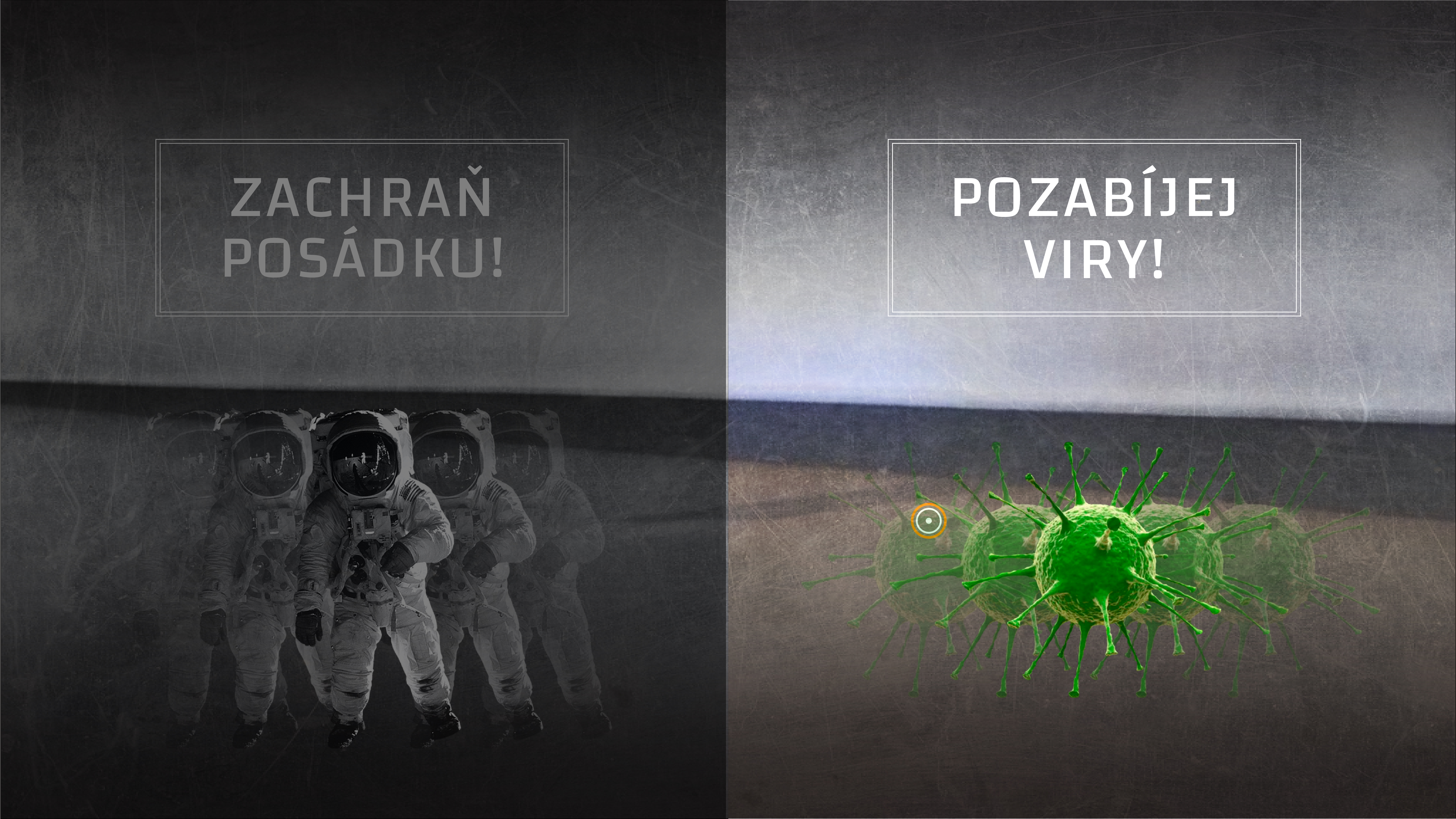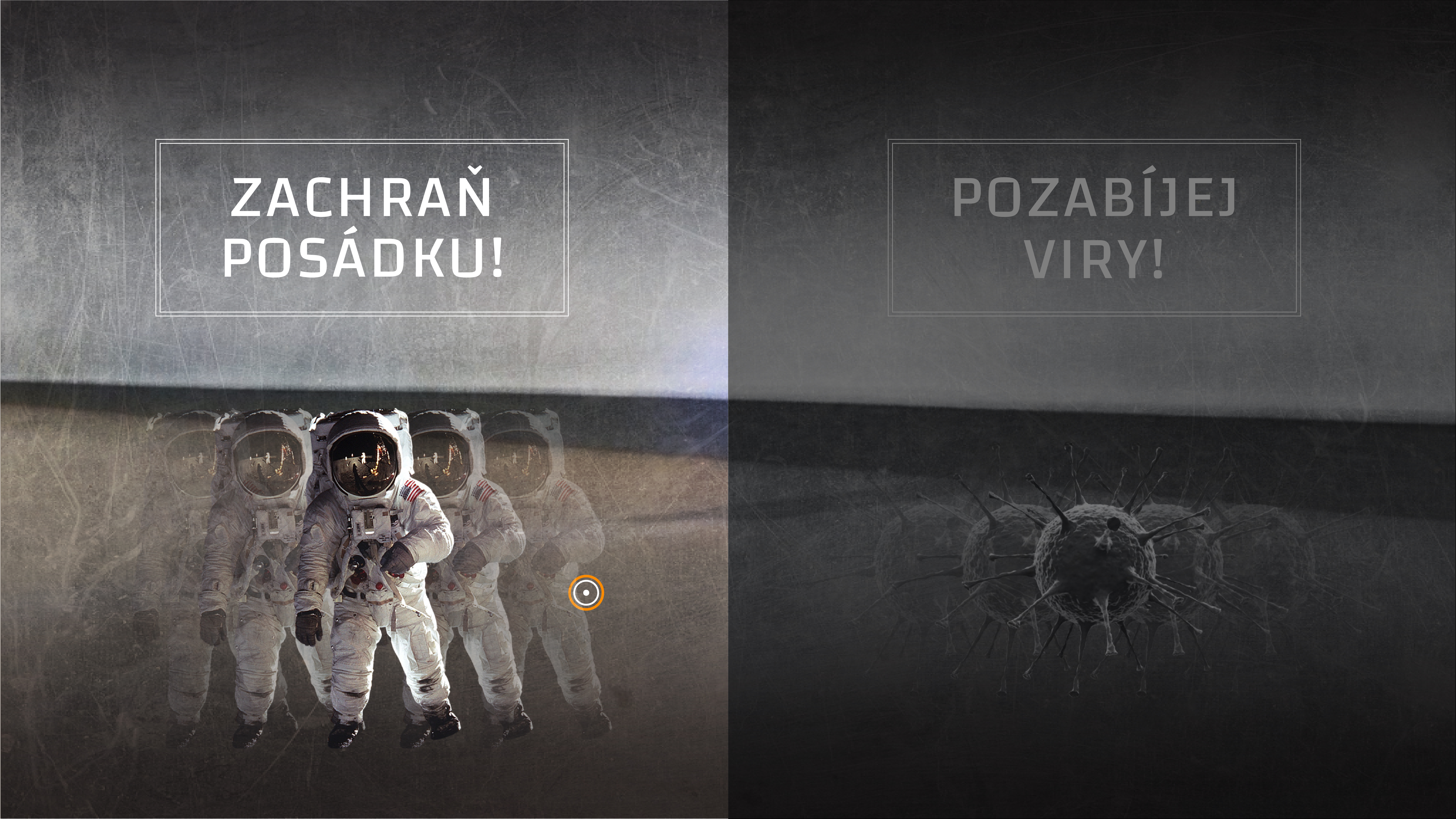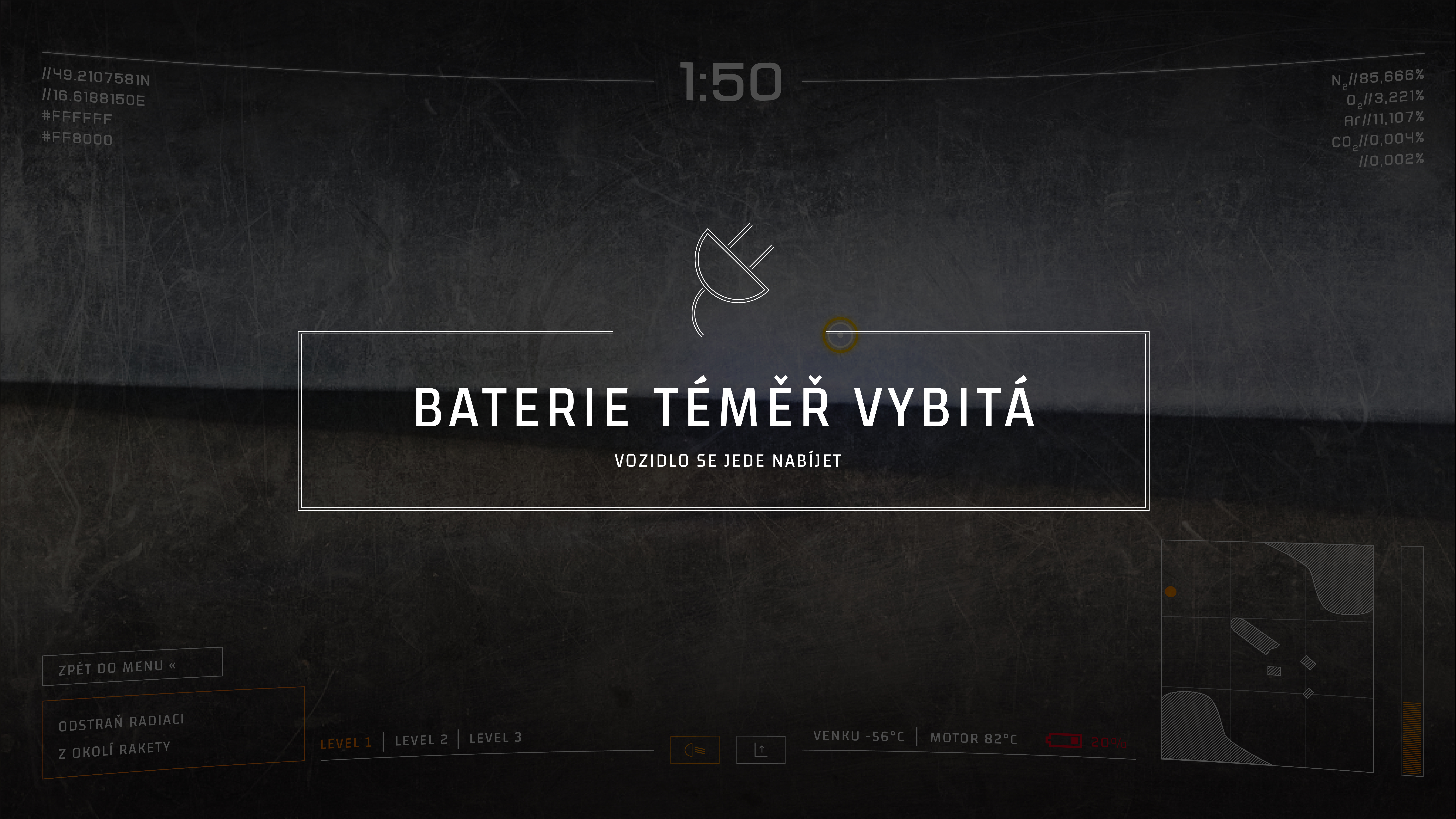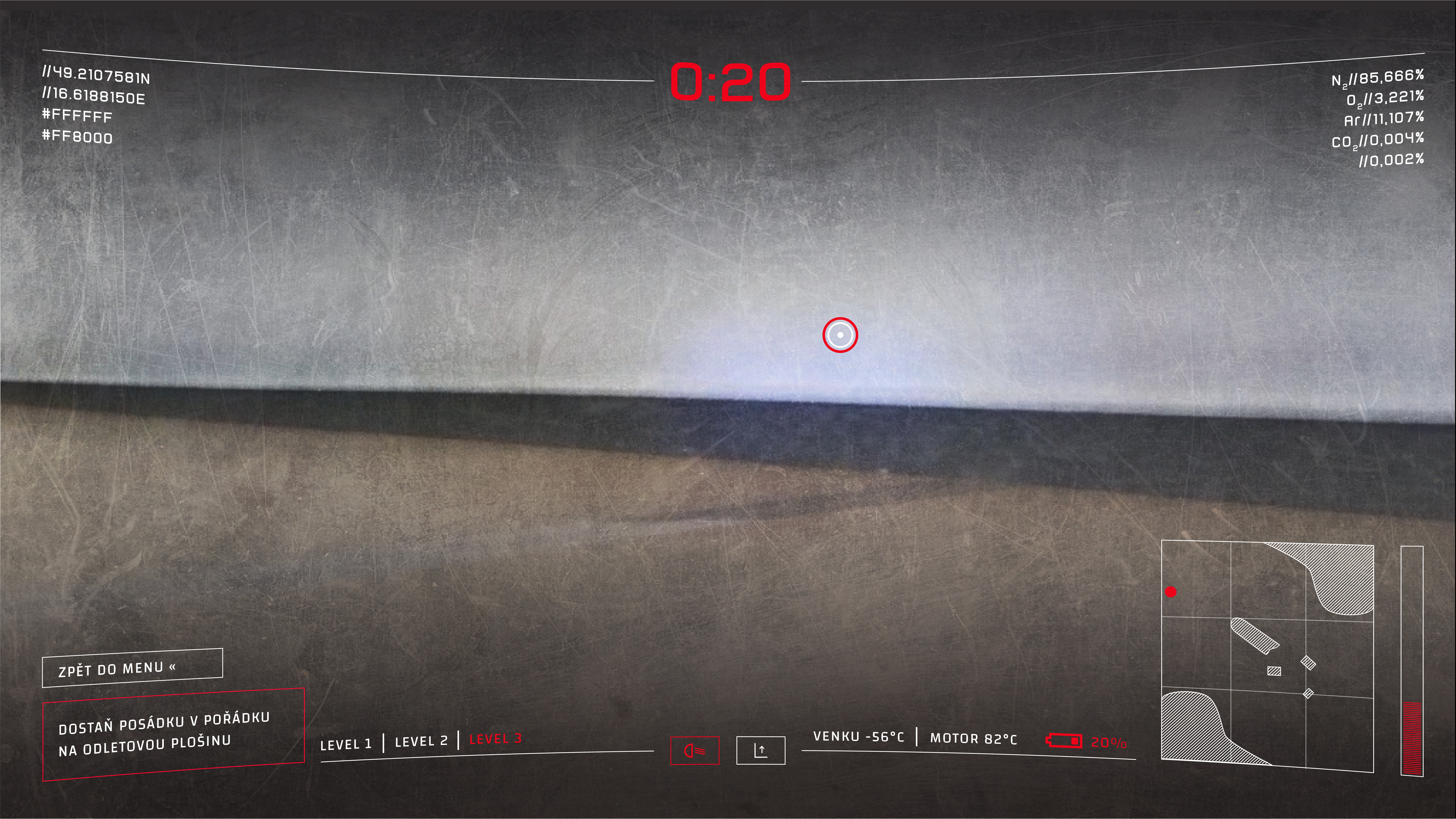 Uživatelské prostředí robota jsem pojal formou spíše křehkých čar, které napodobují iluzi prostoru, což divákovi pomáhá se dostat více do hry. Pro podpoření atmosféry hry jsem pracoval se stíny v horní a dolní části, které zlepšují čitelnost a přehlednost, společně s jemnou texturou přes obraz. V samotné hře jsem počítal s úvodem diváka do hry, instrukcemi, výběrem misí a hry obecně, prostředím při "běžném" projíždění, otázkami astronautů první posádky, hlášením o vybití akumulátoru, a o úspěchu či neúspěchu mise.