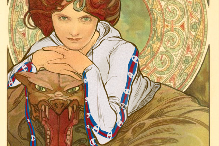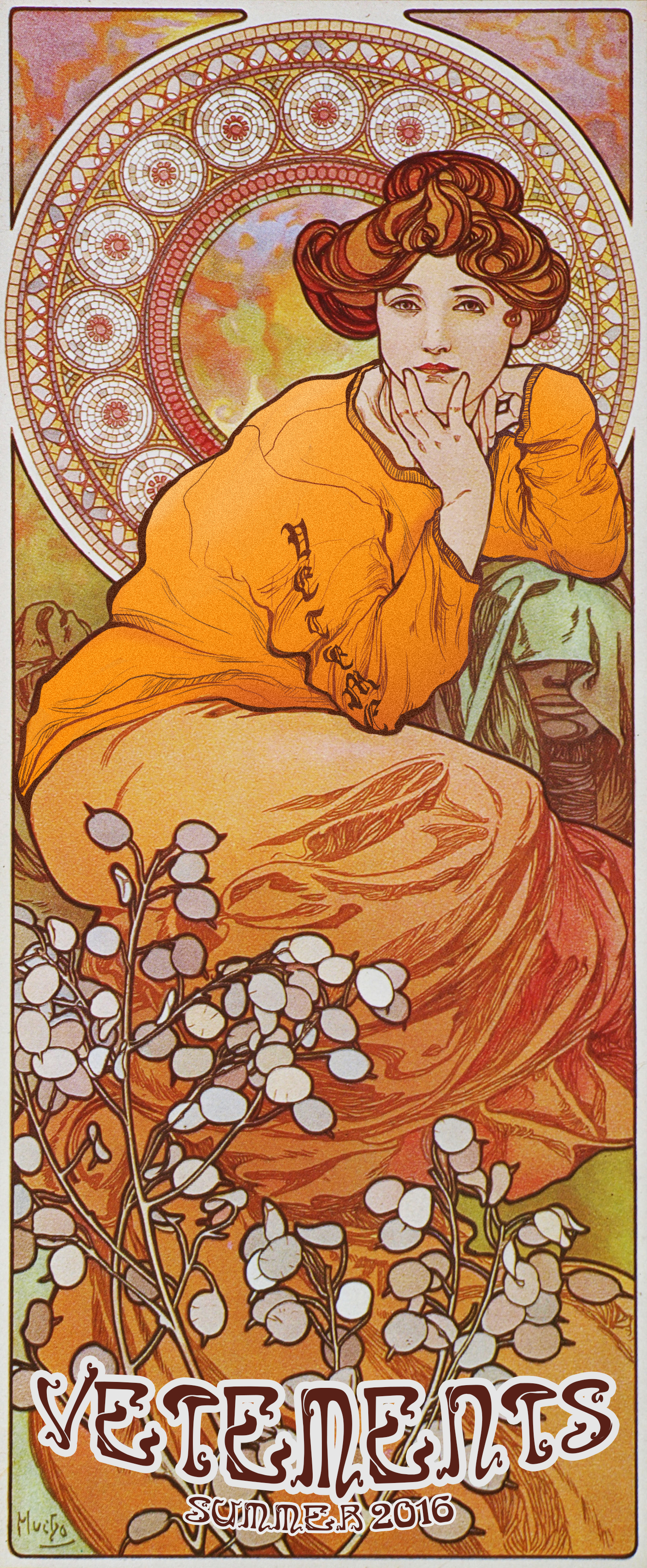 Digitálna reprezentácia umeleckého smeru Art Nouveau. Reklamné plagáty pre značku Vetements. Digitálna ilustrácia oblečenia je umiestnená na dielach Alfonsa Muchu - Amethyst, Topaz a Emerald.