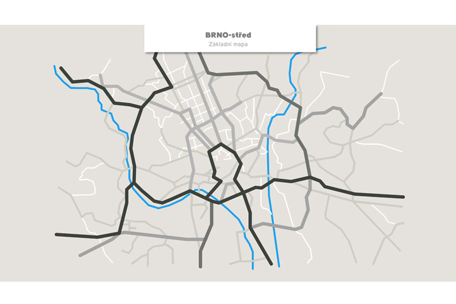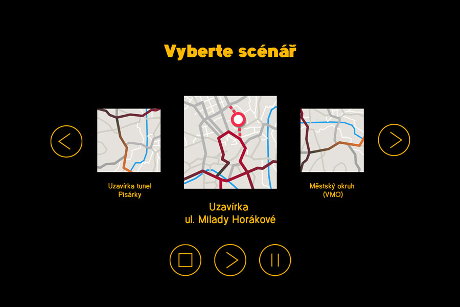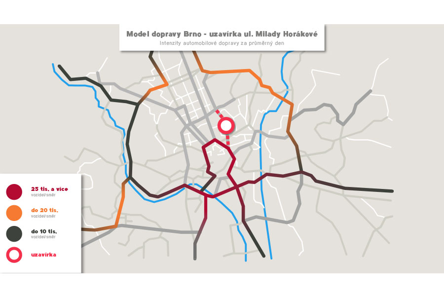 Znázornění dopravní situace v centru města Brna po uzavírce ul. Milady Horákové.