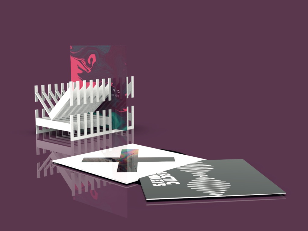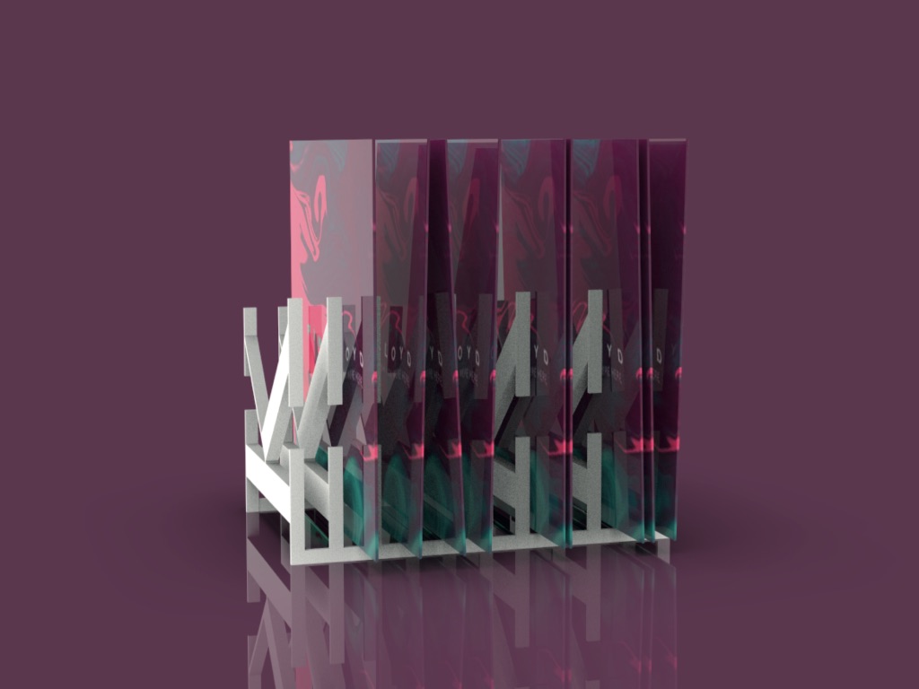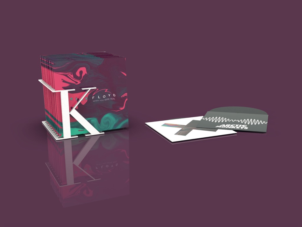 Práca na tému písmo v priestore - typografia. Stojan na platne vytvorený z písmena K. Môže mať rôzne polohy.