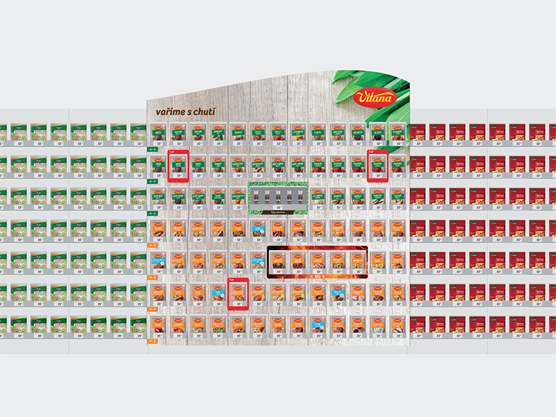 Jako první jsem řešil jak zvýraznit koření od Vitany tak, aby bylo jasně viditelné již z dálky, a také z rohu uličky v supermarketu (pro viditelnost z dálky přesahuje horní okraj přes regál / pro viditelnost z uličky vytáhnutý okraj do strany). Matrice je navrhnutá tak, aby ji šlo používat celý rok - nehledě na roční období (sezónní nabídky koření) + zvýraznění sezónního koření pomocí rámečků, které lze měnit dle potřeby (ná rámečku je výsek, na desce pouze výřez pro zastrčení. Ostatní koření řazeno dále podle abecedy. Rámečky lze použít také například pro koření ve slevě. Na bočním panelu abeceda pro lepší orientaci v regálu. Grafika panelu vychází z aktuálního vzhledu sáčků od vitany - světlé dřevo doplněné o logo vitany. Horní okraj desky je oříznutý podle křivky v logu. Celou desku lze složit na díl cca 45cm široký, tak aby její transport nezpůsoboval komplikace. Materiál zvolit podle délky používání - karton (levný, rychlejší opotřebení) na 1-2 roky, pokud déle tak už volit PVC (nevýhoda - vyšší váha, vyšší náklady, obtížnejší instalace). Upevnění k regálů pomocí závěsných háčků nebo pomocí pěnové oboustranné 3M pásky.