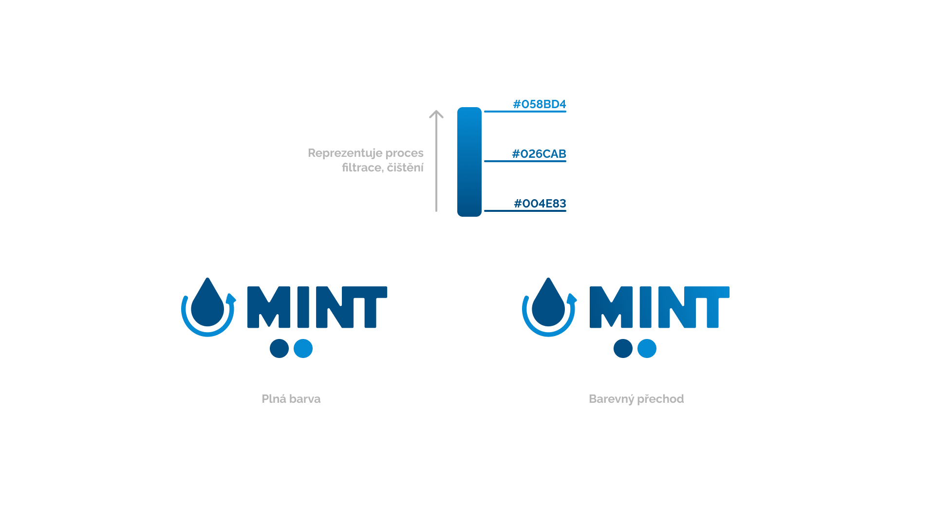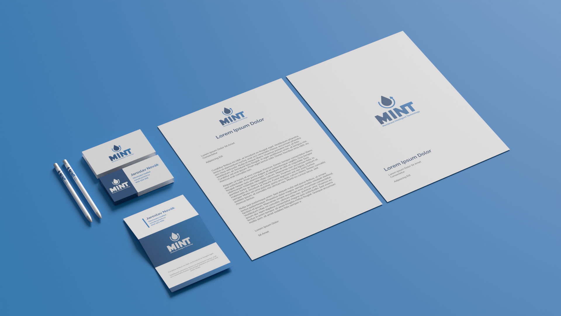 Tvorba loga a vizuální identity pro značku MINT, zabývající se filtrací a recyklací vody. Vychází z kombinace prvků kapky, inteligence a recyklace, spolu se svěží barvou reprezentující proces čištění vody. Návrh byl vybrán pro další spolupráci s klientem.