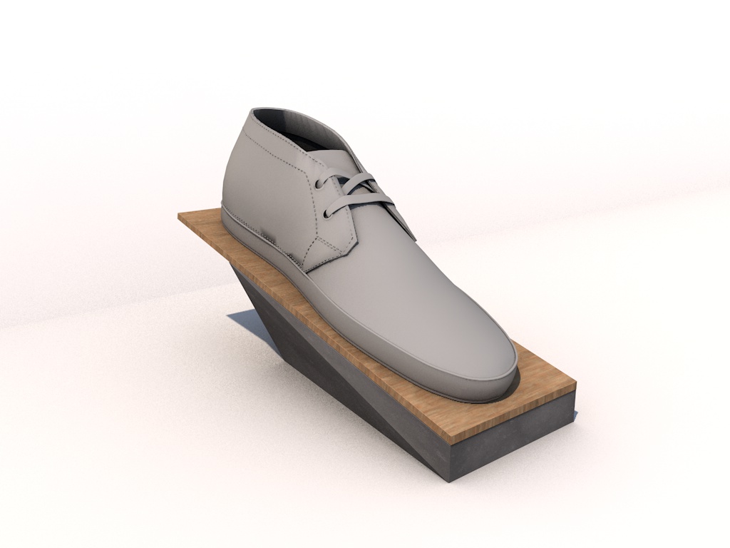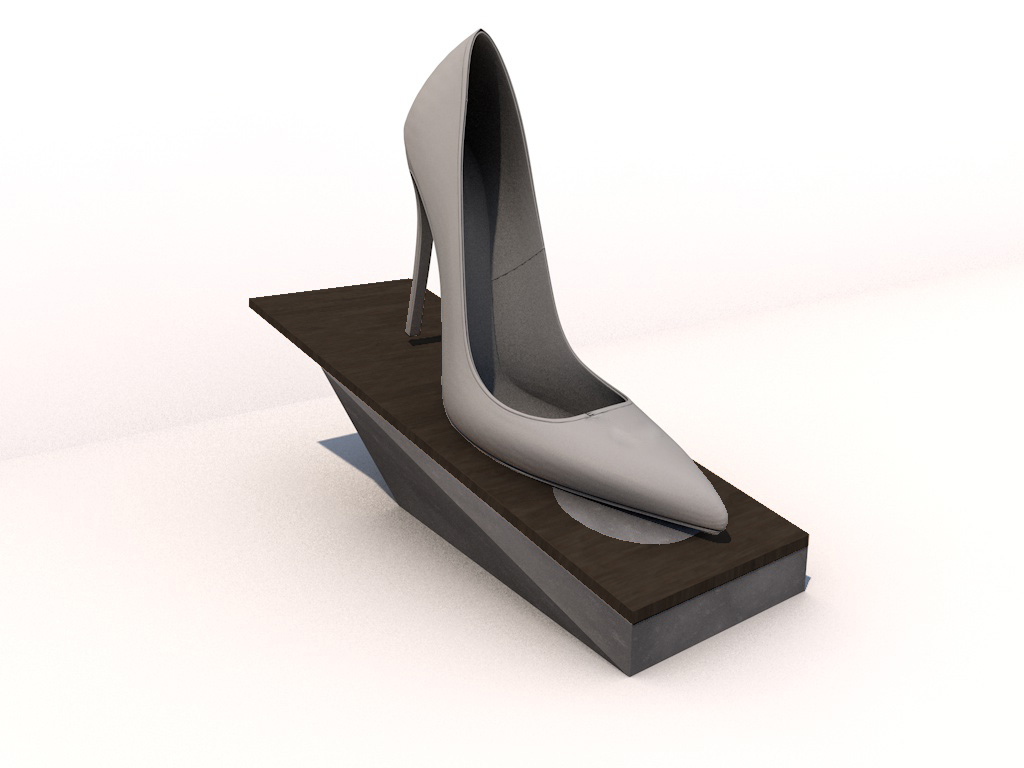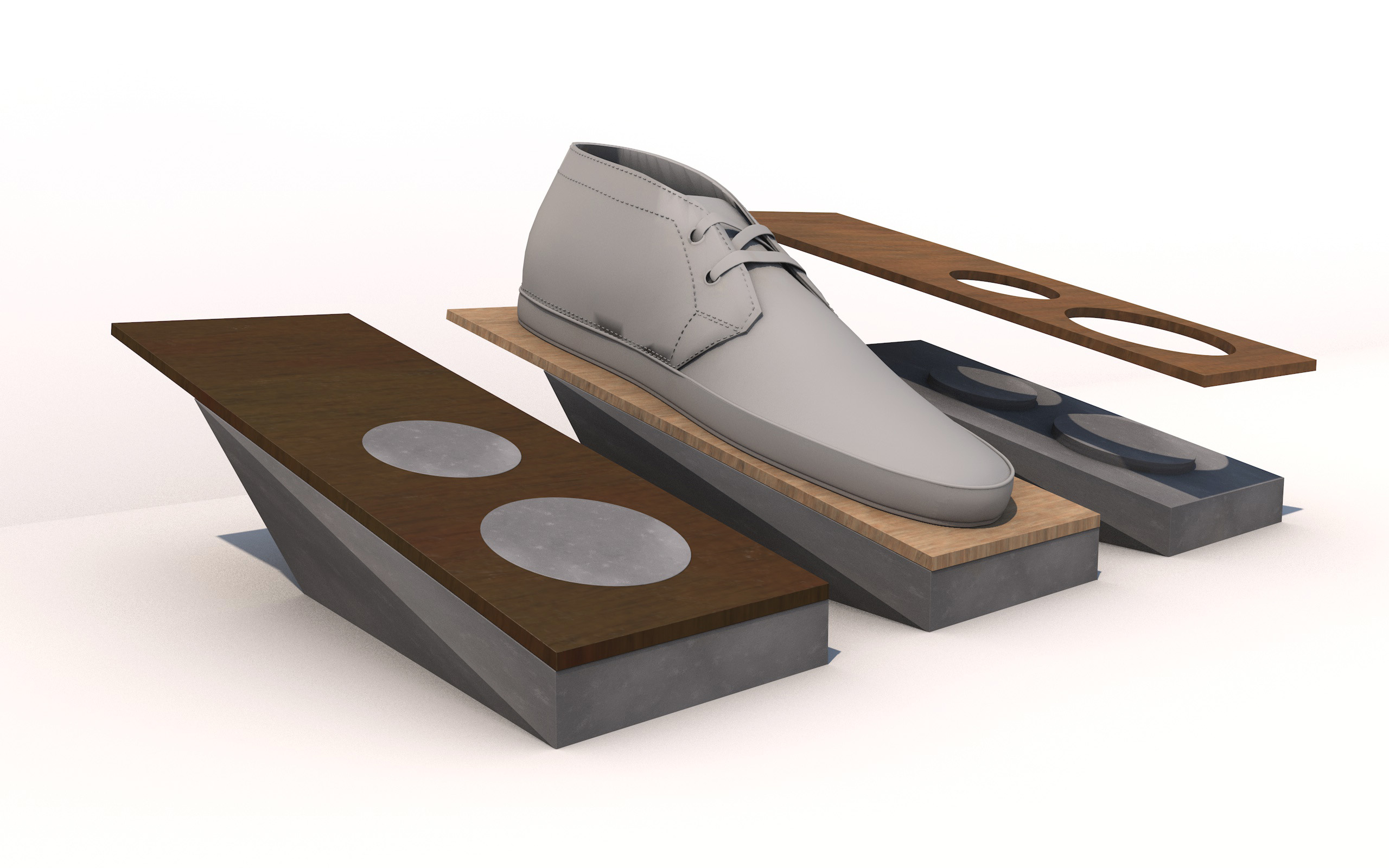 Betonové tělo s variabilní dřevěnou dýhou. Umožňuje přizpůsobit podstavec typu obuvi barvou dřeva či gravírovanou texturou.