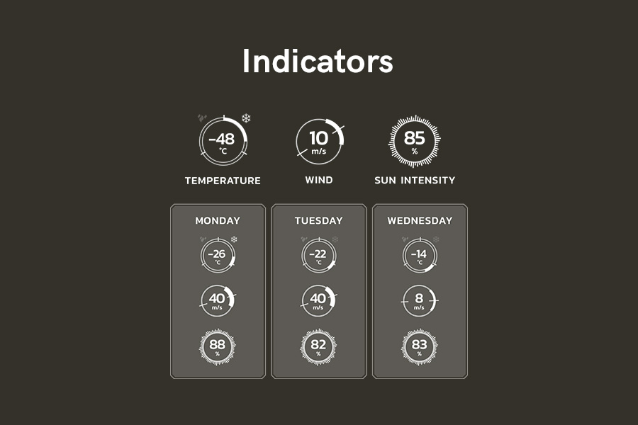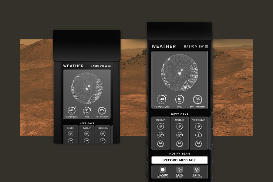 I've designed application for wearable device focused on weather on mars. Colonizators can track storms, temperature, wind and sun intensity. You can find interaction video prototype here – https://youtu.be/OuGQ8rgckBY.