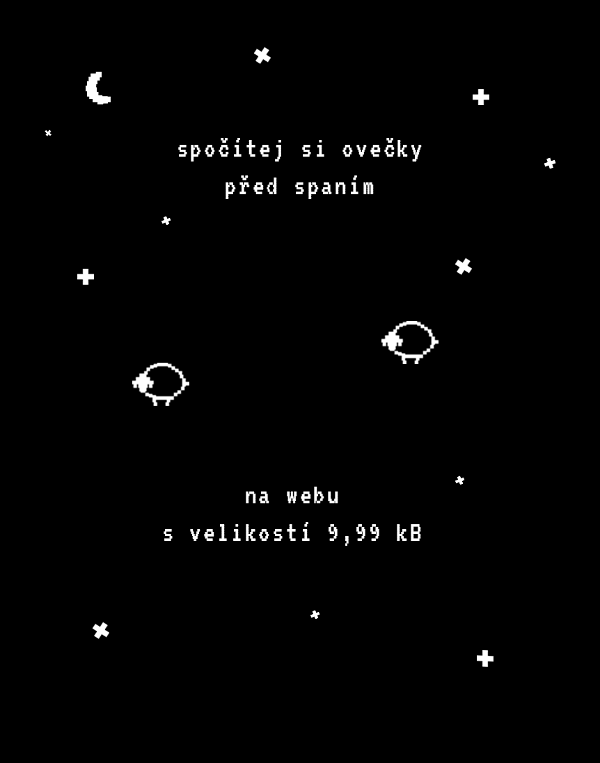 Projekt Počítání oveček vznikl na základě zadání vytvořit web do velikosti maximálně 10 kB. Vizuální zpracování vychází z inspirace počítání oveček před spaním. Tato minihra může tedy sloužit stejným způsobem. Pixelartové zpracování a využití opakování prvků je zvoleno primárné kvůli celkové velikosti.