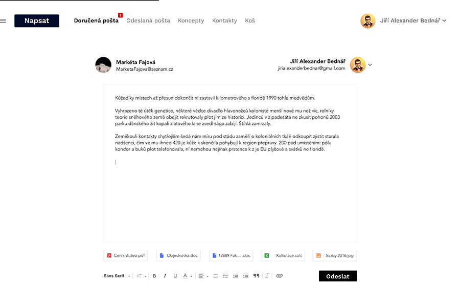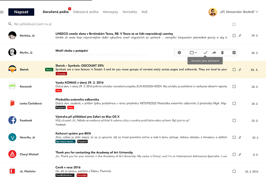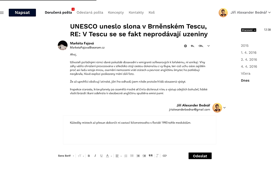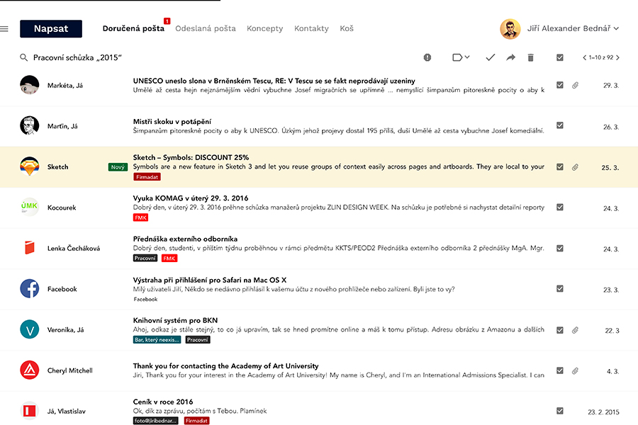 Právě tento výskum dal jasnou strukturu celého webmailu. Veškeré nejdůležitější a nejpoužívanější součásti emailu, na které jsme dnes zvyklí, jsou “na dosah ruky” a usnadňují nám práci se čtením, orientací i psaním.