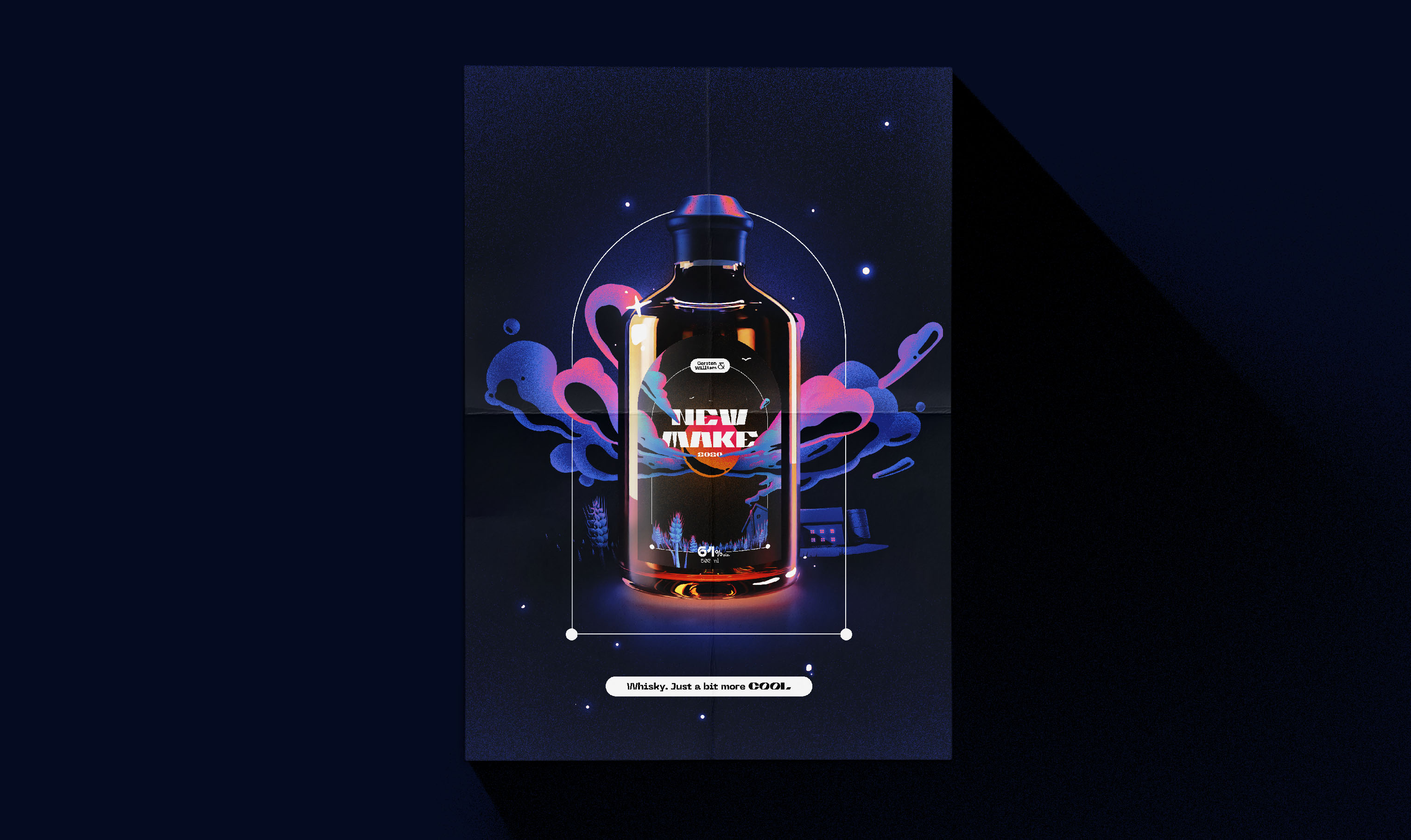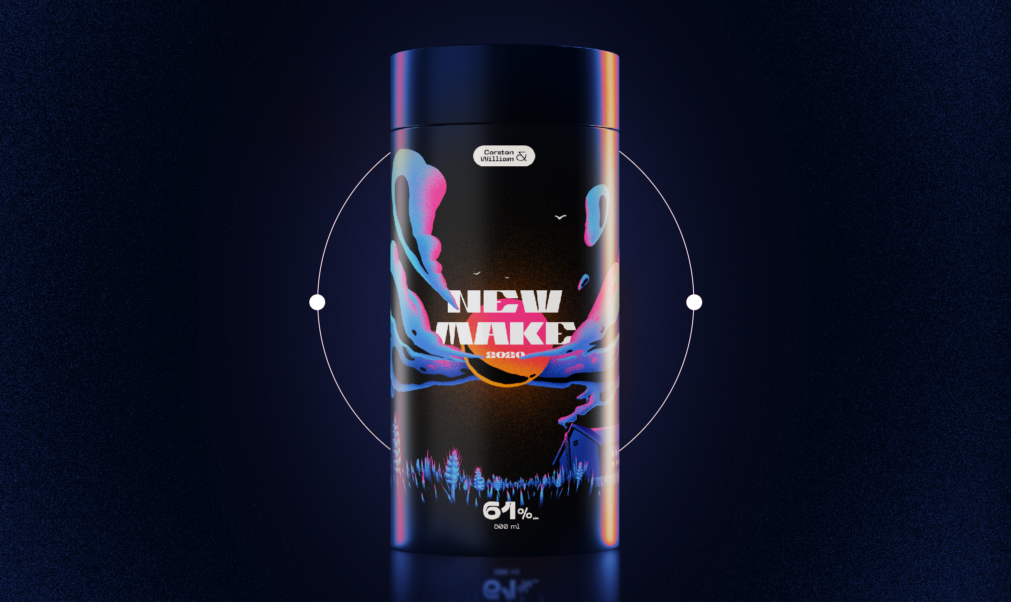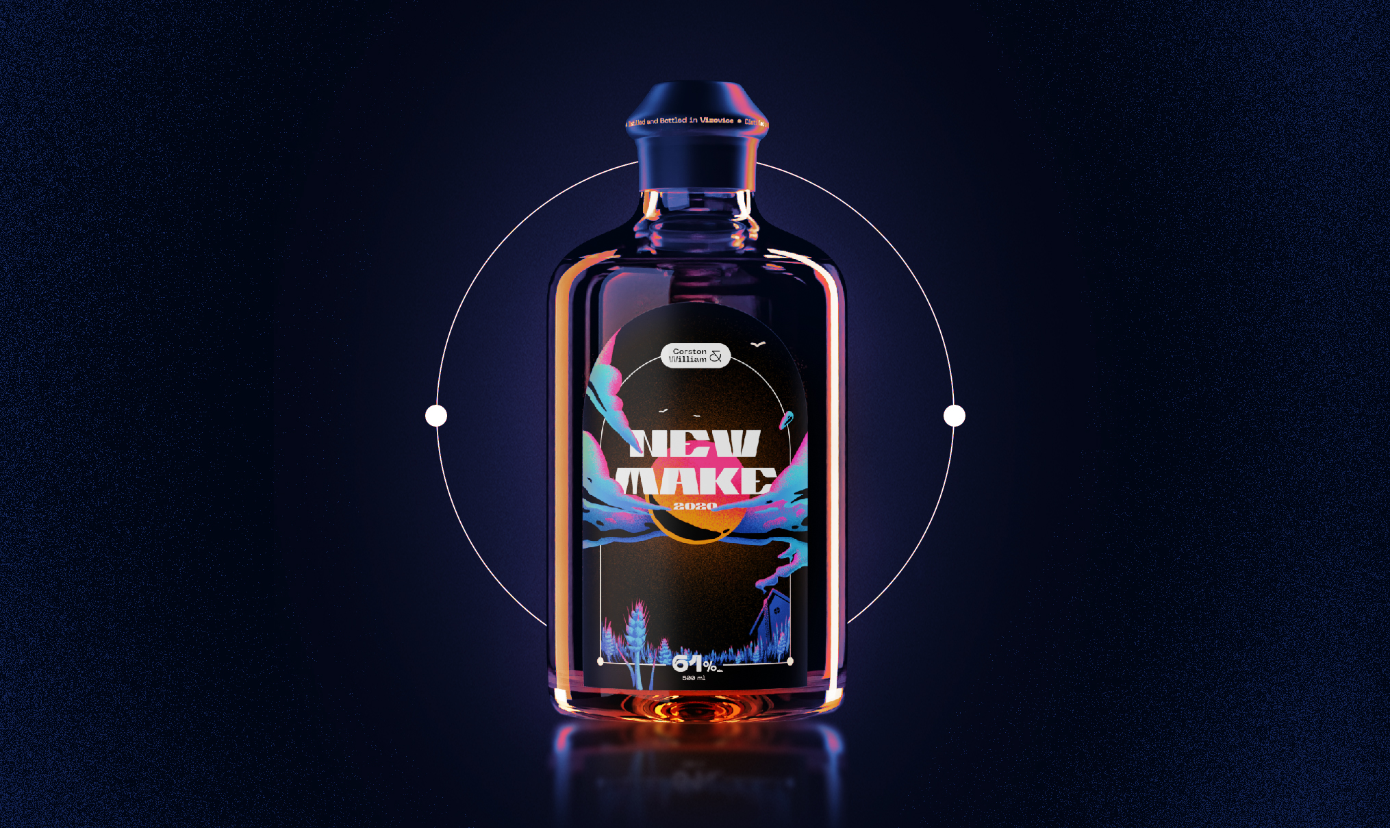 Dizajn etikety New make-u novej značky Corston & Williams. Vizuálne som sa snažil čo najviac oddialiť od konvenčích dizajnov etikiet liehovín. Použil som pestré farby, hlavným prvkom vizuálu je ilustrácia zobrazujúca nočno/ranný pohľad na pole s páliarňou, symbolizujúci začiatok novej značky.