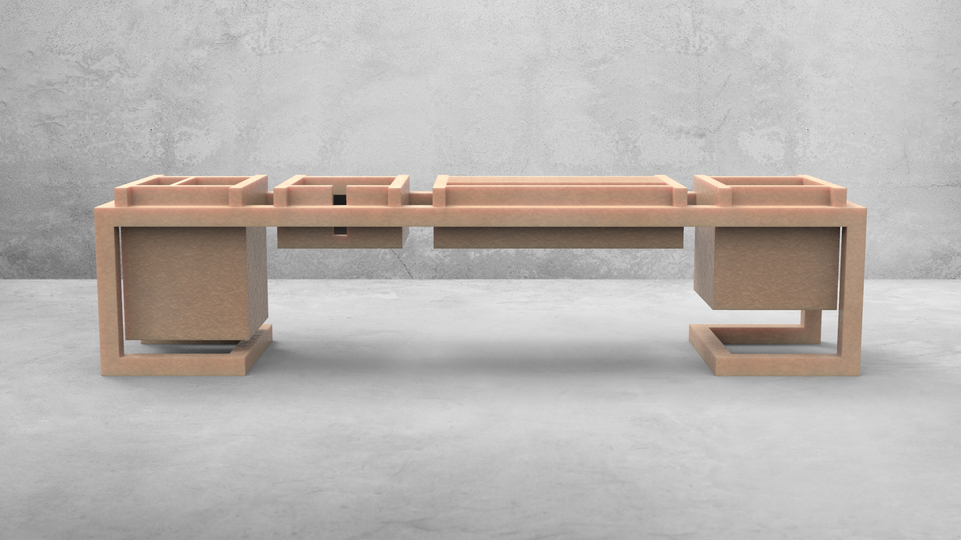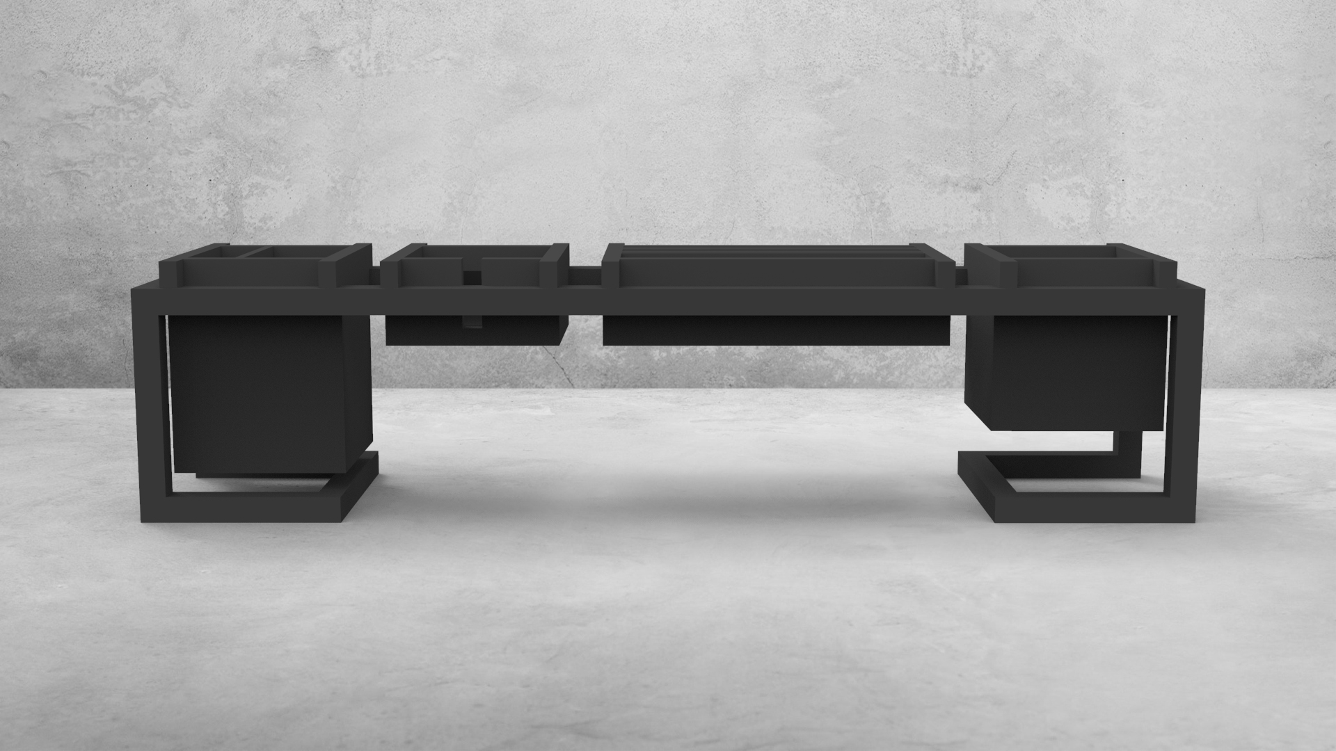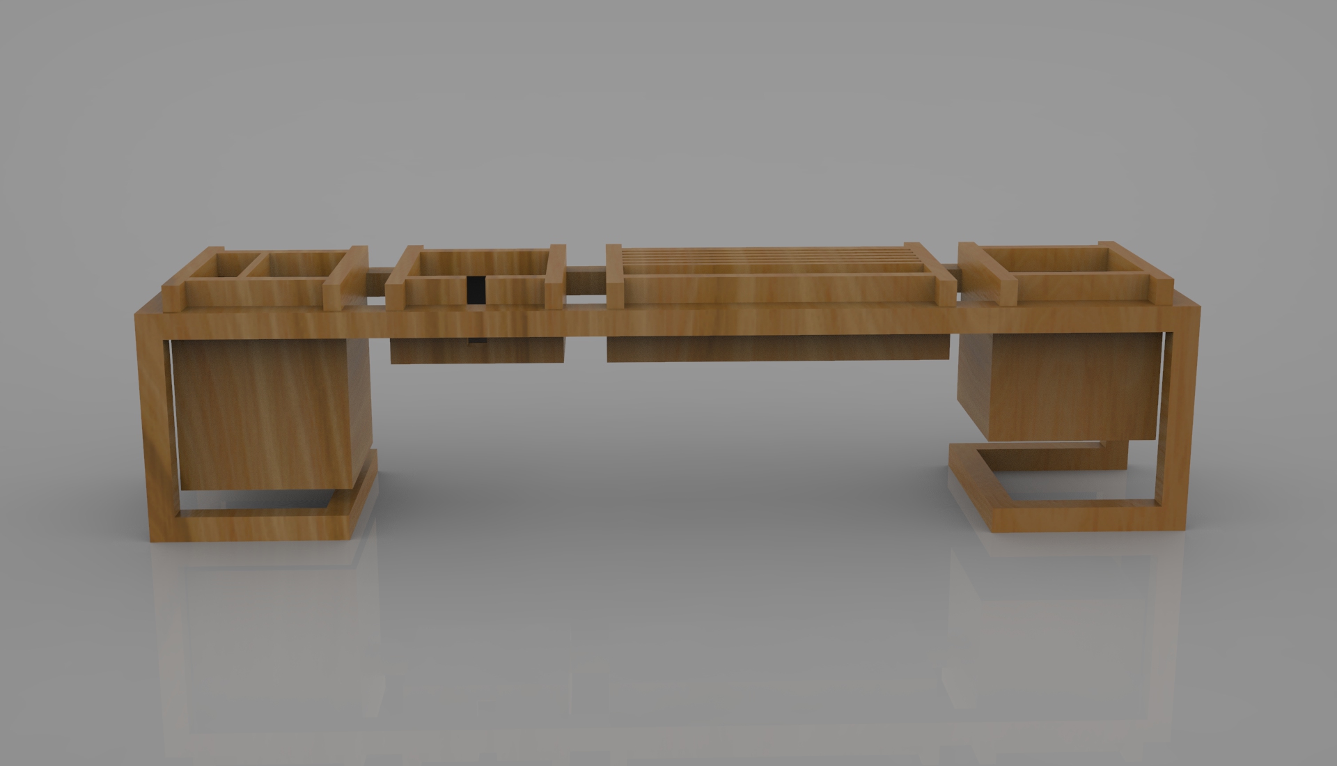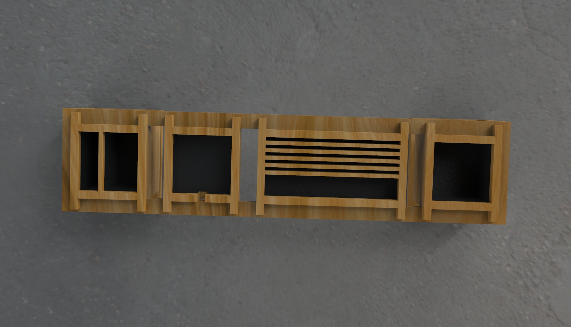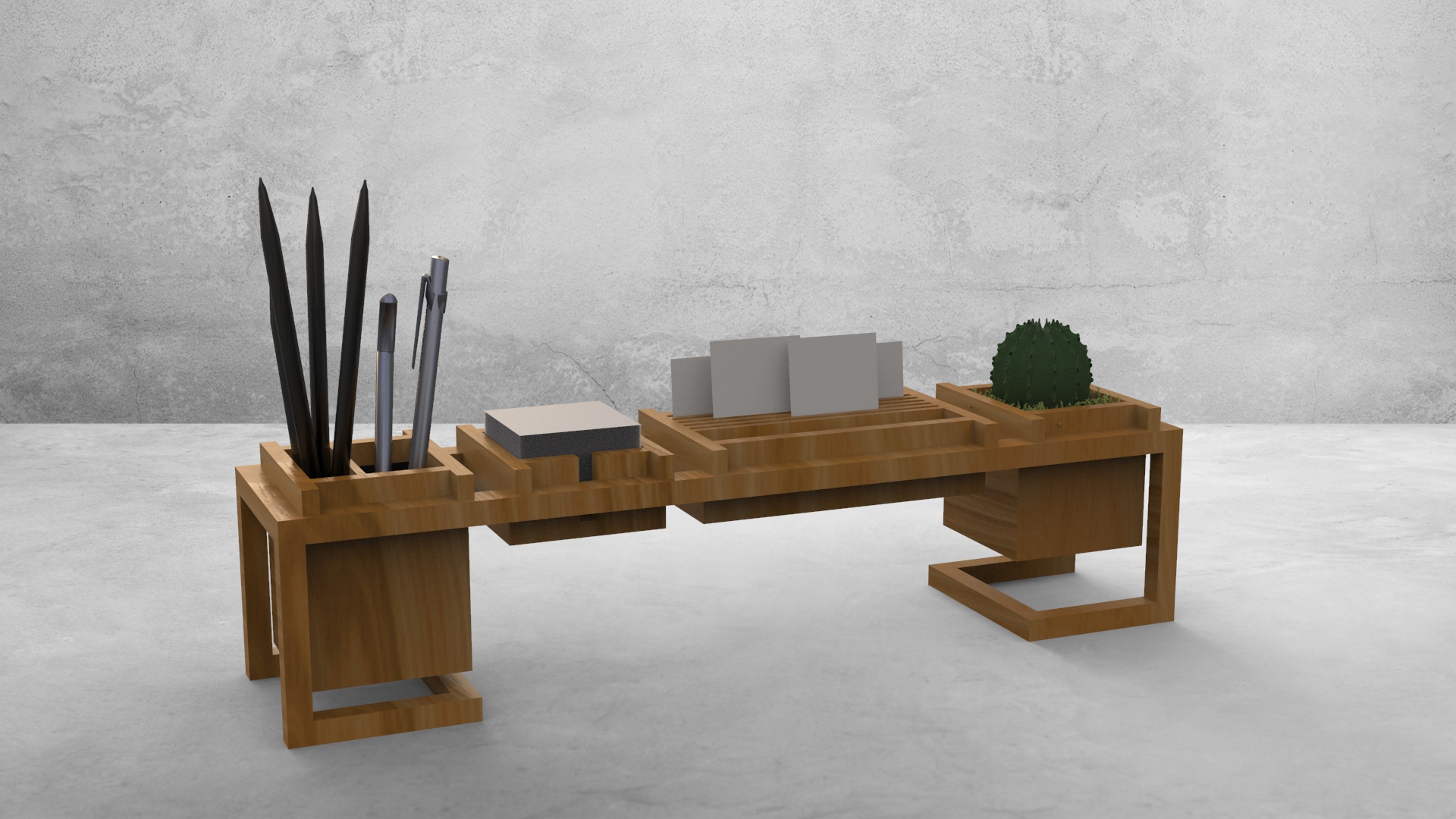 Závesná sada doplnkov na pracovný stôl vytvorená z preglejky. Je kompaktná a nezaberá veľa priestoru, keďže sa dá využiť aj ukladací priestor ktorý vzniká pod ňou. Každý kus setu sa dá v prípade potreby vybrať zo stojana.