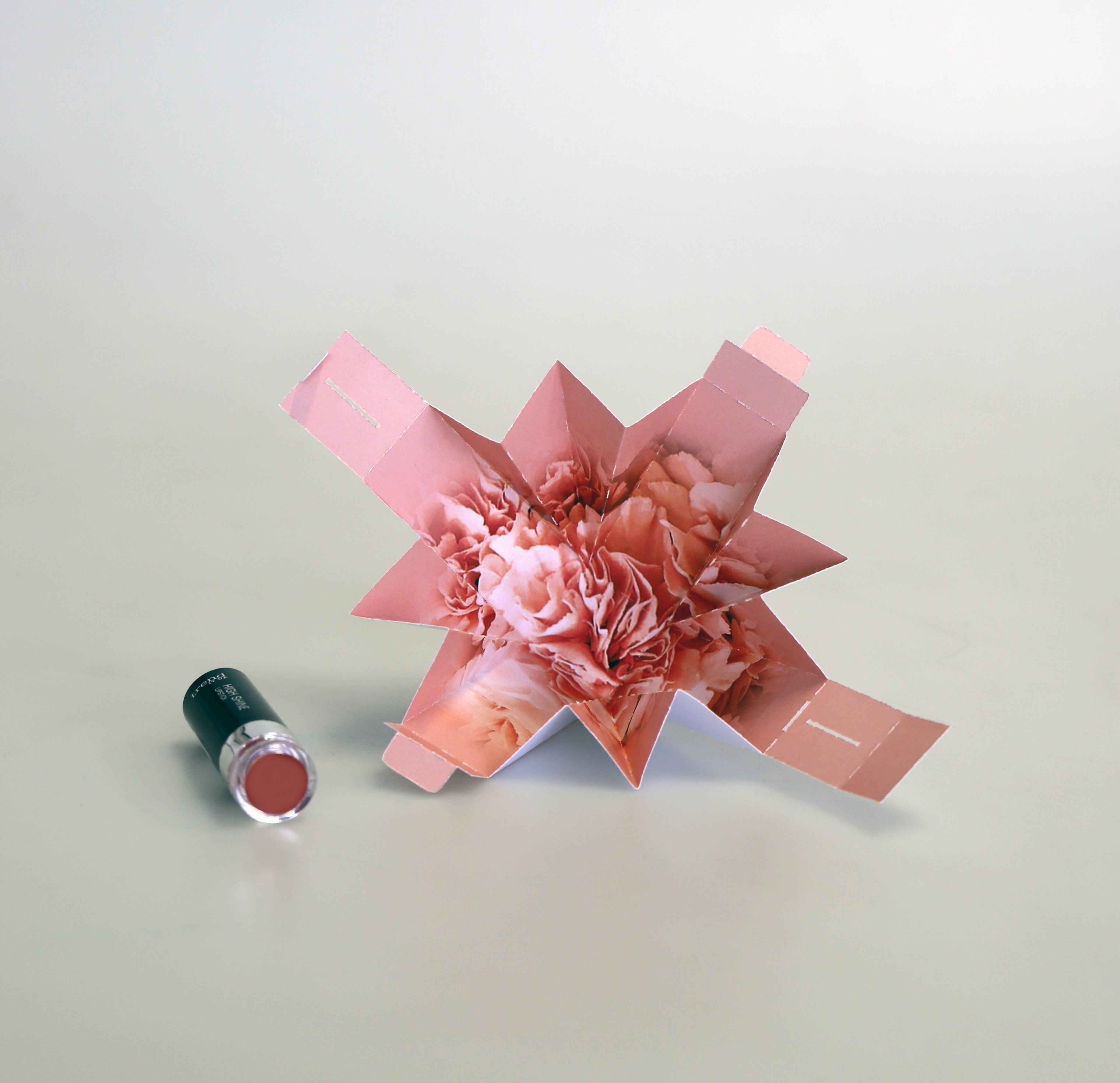 Návrh obalu rtěnky, která se má při rozbalování rozkvétat na rukou.