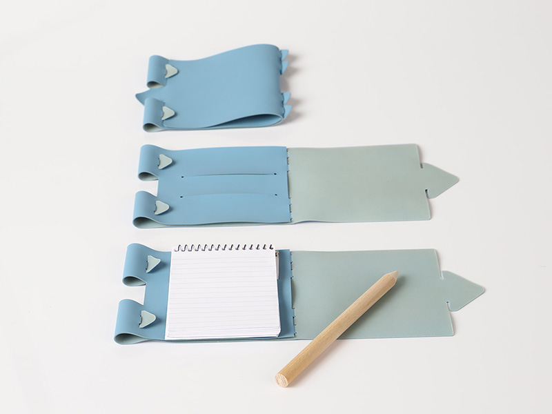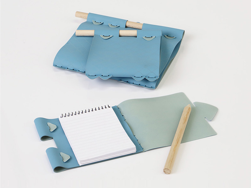 Princípom diplomovej práce je využitie nerecyklovateľného plošného odpadu na produkciu malých obalov alebo iných priestorových predmetov dennej potreby. Vysekávaním materiálu a jeho následným spájaním pomocou suchých zámkov je docielená minimálna energetická náročnosť. Výsledkom sú dva obaly na zápisník a pero, ktoré pri nich slúži ako poistka zámku. Oba nadväzujú na už existujúci peračník a obal na slúchadlá vyrobených rovnako z ofsetovej gumy.