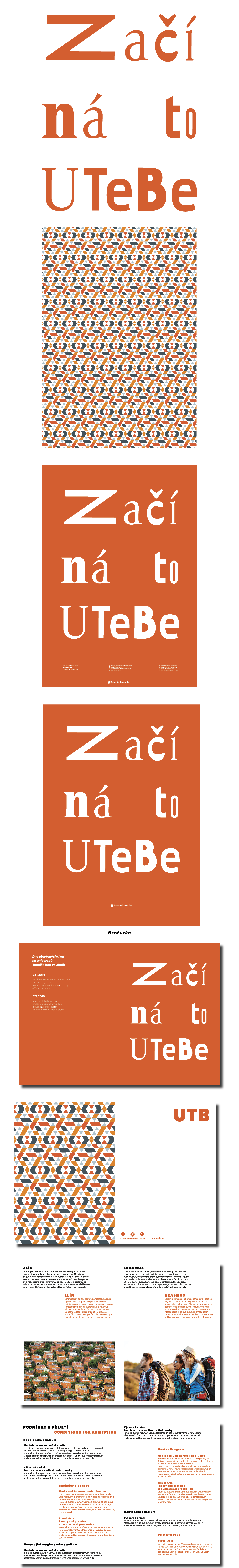 V identitě claimu UTeBe jde především o zisk budoucích studentů. Většina škol sází na moderní, čistý a seriózní design. Ale co když půjdeme proti proudu? O to se snažím velmi hravým písmem dobarveným doplňkovou oranžovou. Posunout seriózní tvář stranou a ukázat světu “své hravé já“. Text je zarovnán na osu a rozdělen tak, aby vznikly co nejmenší problémy při čtení a zároveň splňoval estetickou část věci.