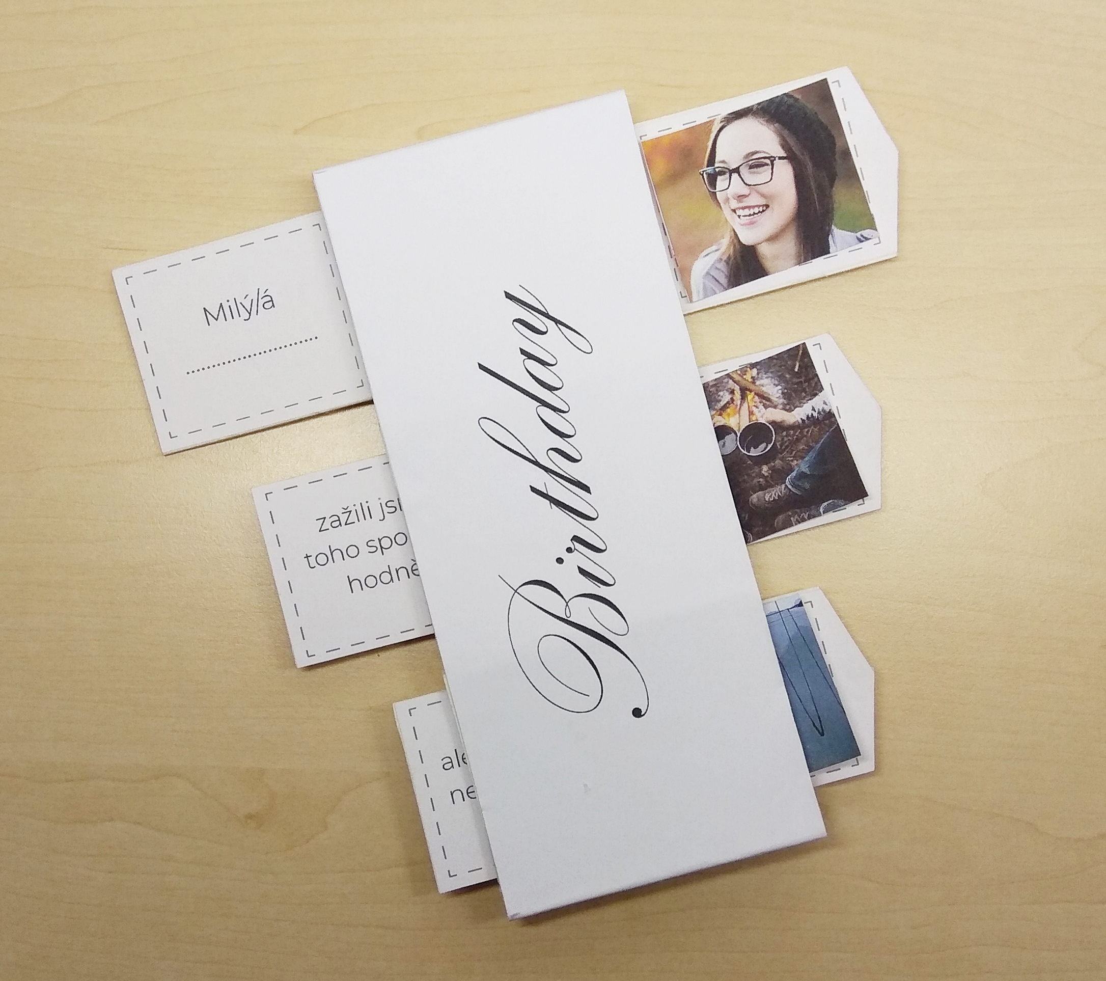 Obálka na voucher nebo peníze s přáním. Přání se skládá z několika kartiček, které se vytahují. Zatáhnutím kartičky na pravé straně se vytáhne i na levé straně. Na levých kartičkách najdeme text. Pravé osobně dotvoříme pomocí fotek.